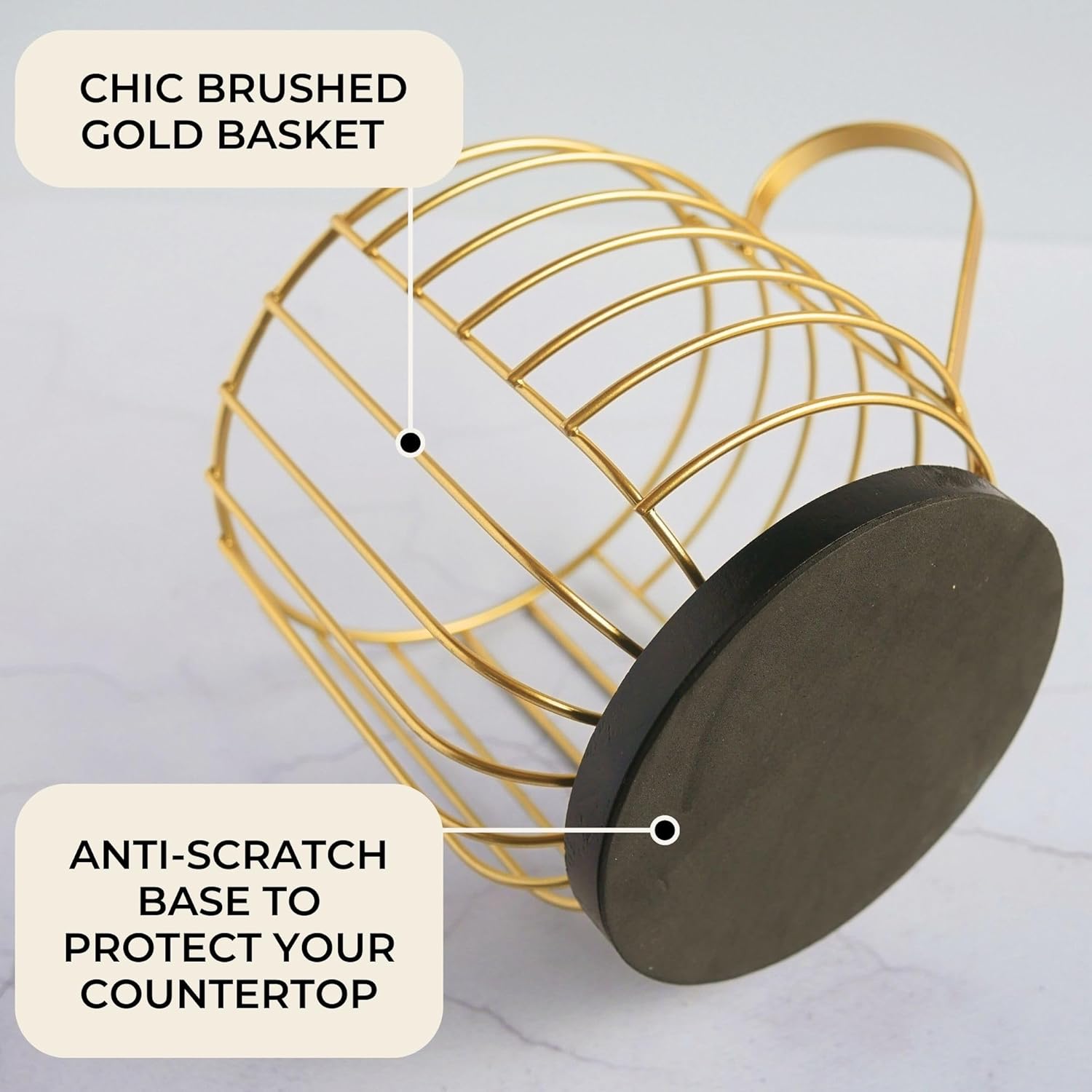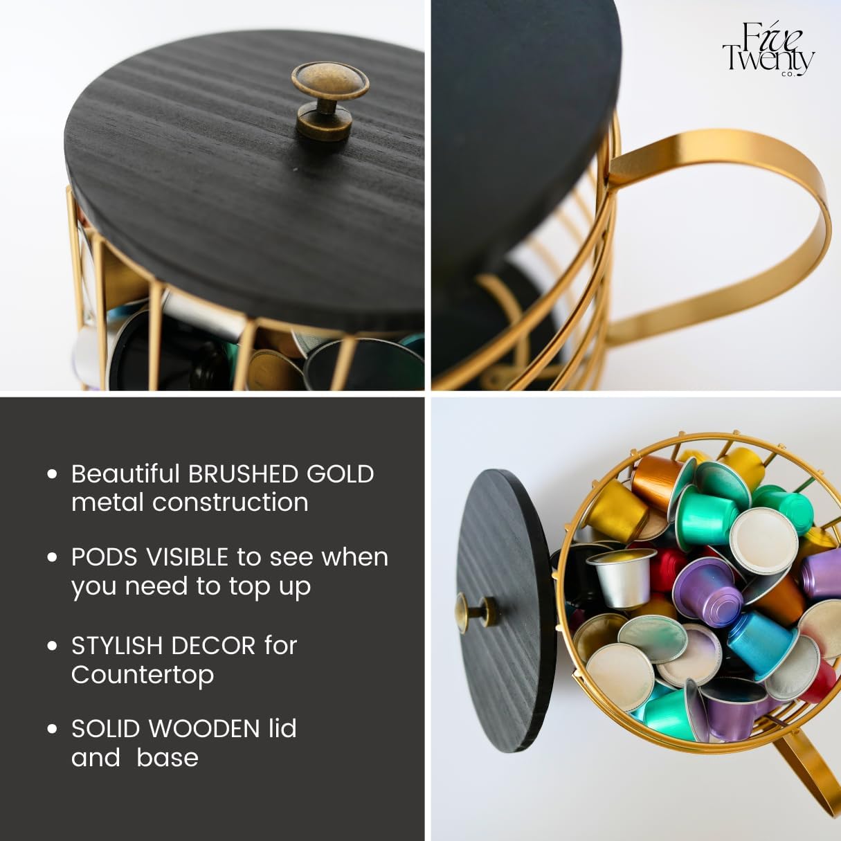 [ CONTEMPORARY DESIGN ]: The elegant gold metal coffee pod basket with a wooden base fits seamlessly into both contemporary and farmhouse kitchen decor, adding a touch of sophistication to your coffee station.