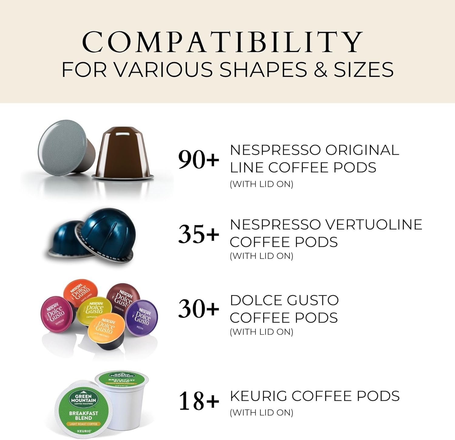 [ VERSATILE COFFEE POD STORAGE SOLUTION ] : Perfectly compatible with Nespresso Coffee Pods, Keurig KCup Pods and other coffee capsules of all shapes and sizes. Itβs also great for storing snacks, cookies, fruit, and more.
