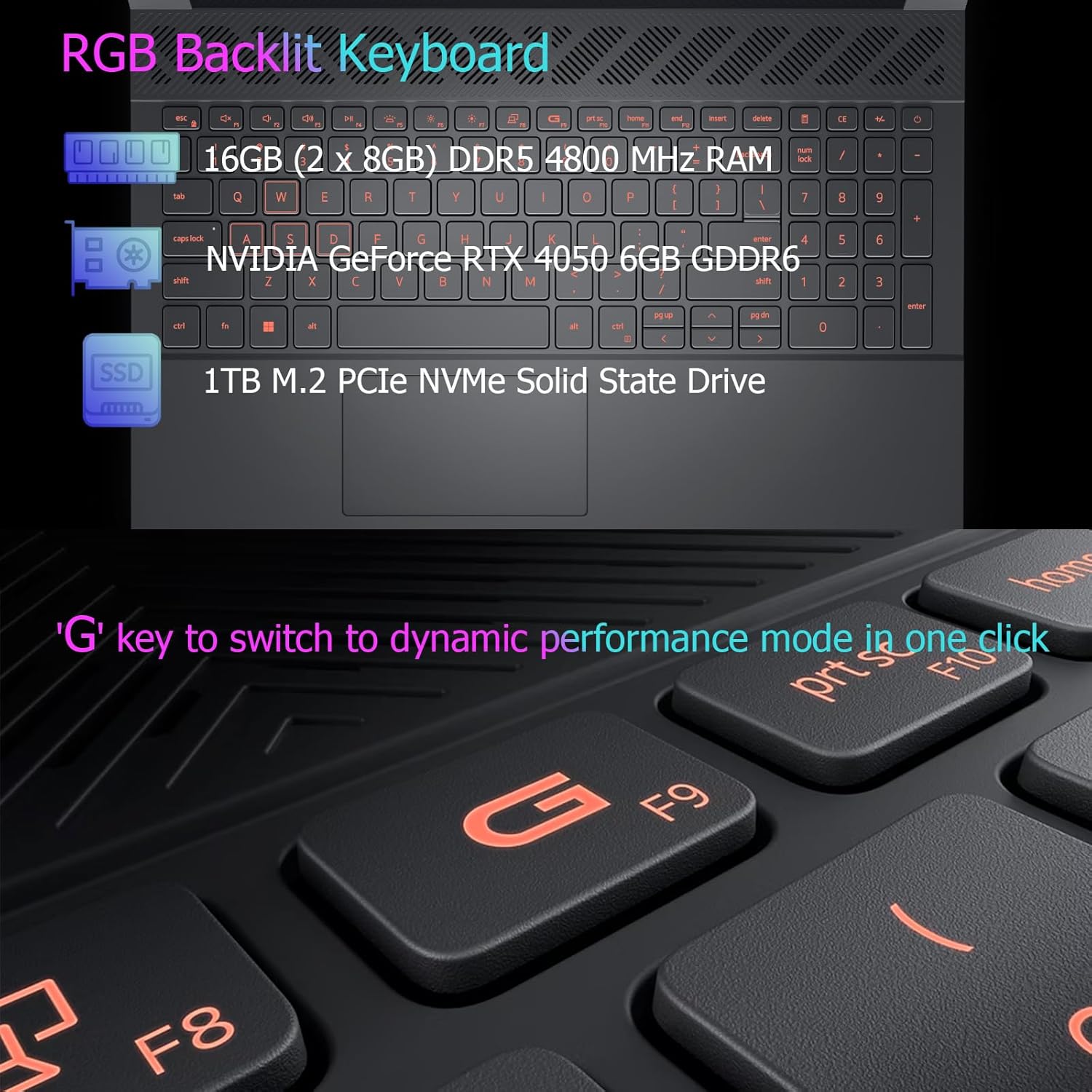 Dell G15 15.6″ 165Hz Gaming Laptop, 13th Inter Core i5-13450HX Processor, RTX 4050 6GB GDDR6 Graphics,16GB RAM, 1TB PCIe SSD,100% sRGB, Backlit Keyboard, Wifi6, HDMI, Windows 11,Black