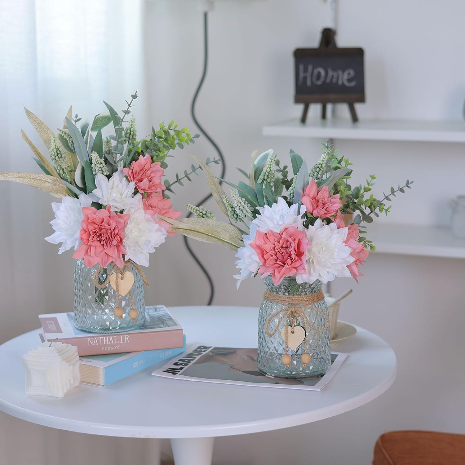 Artificial flowers in a vase: includes 3 dusty pink silk dahlia, 3 white silk dahlia, artificial eucalyptus,willow leaf, fake plants and vases. The glass vases are decorated with heart and globe pendants and twine. The perfect combination of bouquets and vases, the rustic style is perfect for farmhouse decorations, coffee table decorations, and dining room centerpieces.