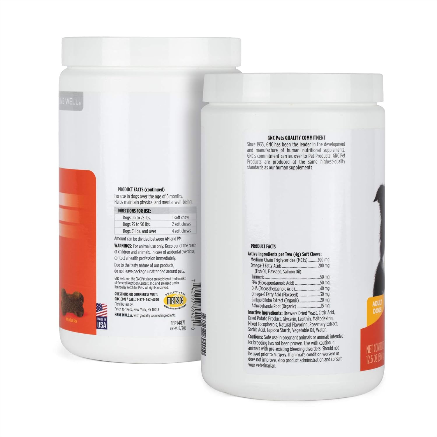 If you’re looking for a way to improve your dog’s cognitive function and brain health, look no further than GNC Pets Advanced Cognitive Soft Chews for All Dogs. These easy to feed soft chews for dogs come in a 90 count of delicious chicken flavored dog supplements to give your dog the support they need to perform and feel their best. Great for behavior, memory, and cognitive function, soft chew supplements for dogs from GNC Pets help your dog thrive. Made with premium ingredients like turmeric, gingko biloba, and ashwagandha, and made in the USA, GNC Pets Advanced Cognitive Soft Chews for Dogs do it all. These dog supplements are suitable for dogs 6 months of age and older. Feeding Guidelines: Give dogs up to 25 lbs 1 soft chew, dogs 25 to 50 lbs 2 soft chews, and dogs 51 lbs and over 4 soft chews. Divide administration of dog supplements between the morning and evening. Dog vitamins from GNC like this are important dog supplies and dog health supplies. Dog vitamins include important ingredients in dog chews for brain health. This dog supplement is one of the best vitamins for dogs. It is similar to others like restorapet to offer adrenal support for dogs. Cognitive support for dogs is essential to support healthy brain function in dogs. For natural health dogs and dogs that want to play a brain game for dogs, consider giving them gnc dog vitamins . YOUR SATISFACTION IS OUR PRIORITY: For any questions or feedback about this product, please reach out to us directly at infofetch4pet