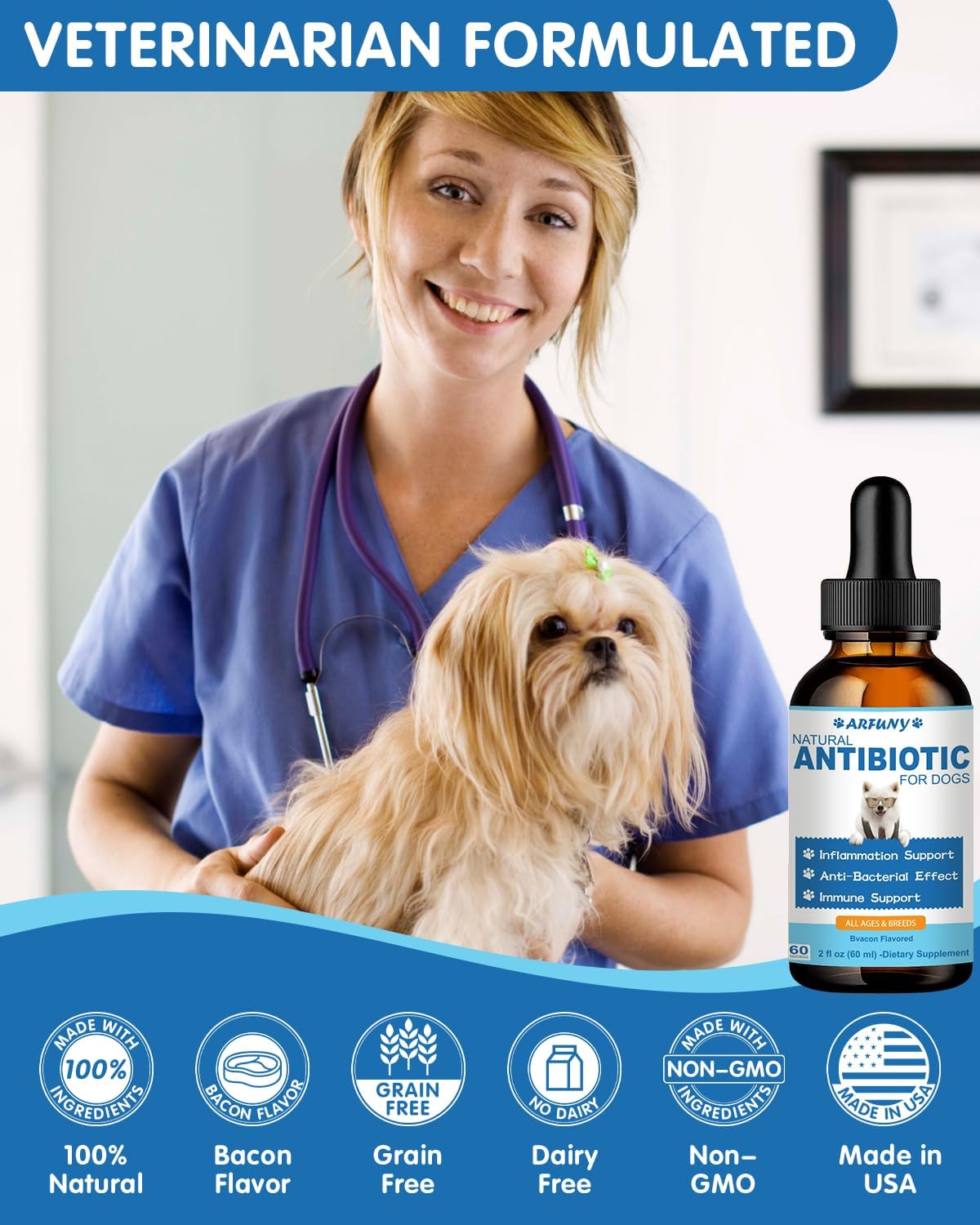 【Best Trust for Dogs】The antibiotics for dogs are made in the USA with a veterinarian-approved formula, using safe ingredients free from grains, alcohol, and gluten, and without any additives or harmful chemicals, making it completely safe for all dogs.