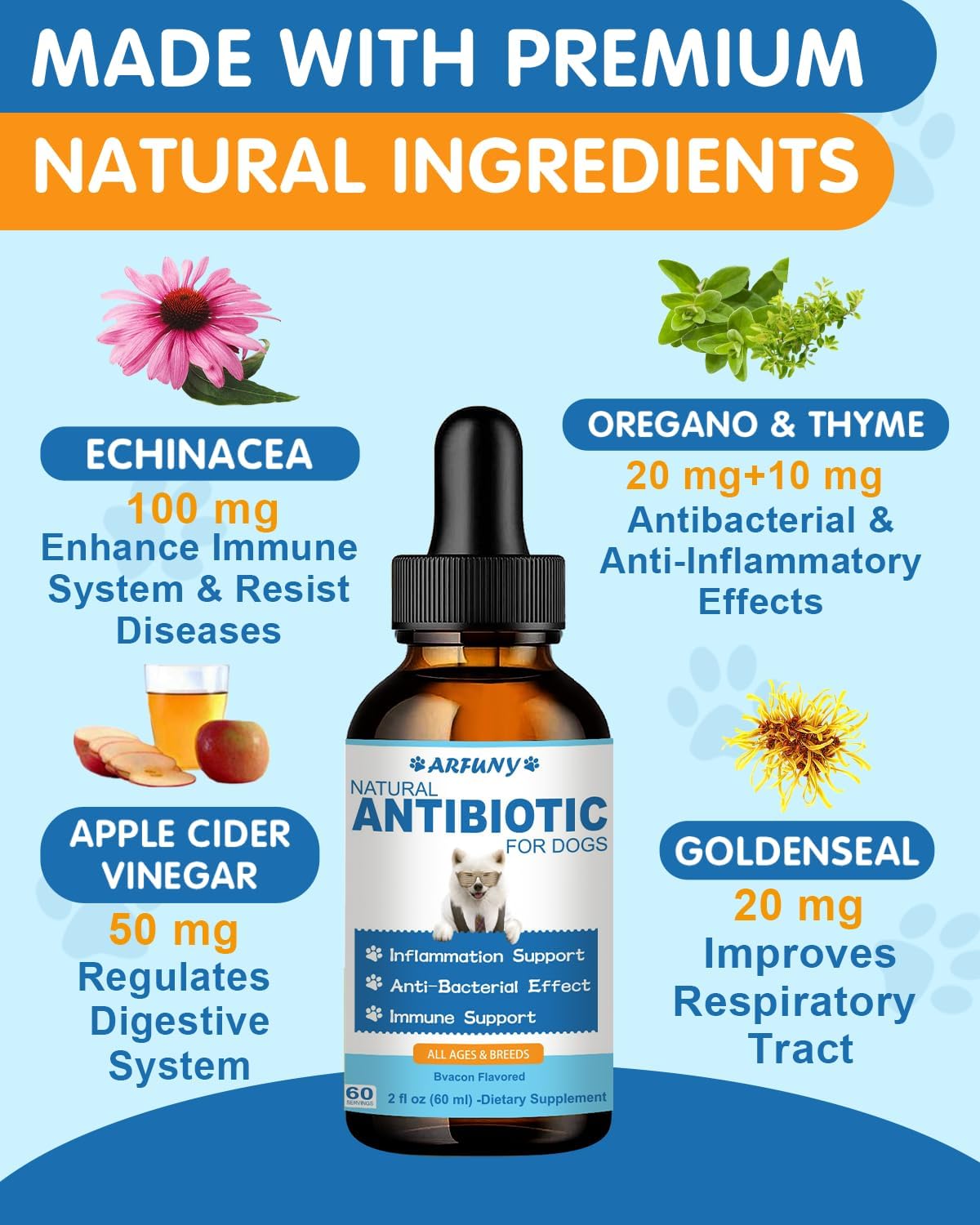 【Premium Ingredients】The natural active ingredients in this pet antibiotics for dogs include echinacea, goldenseal, and oregano. This unique blend of ingredients is designed to provide comprehensive support for your dog’s health, enhance the immune system, promote digestive wellness, combat infections, and support overall vitality in your furry friend.