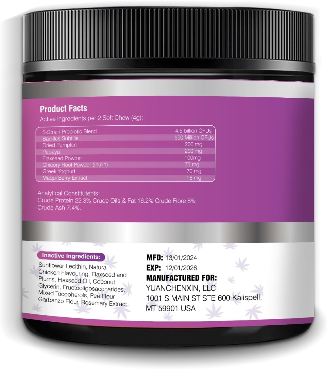 Probiotic for dogs mixed formula:Probiotic chews for dogs include Bacillus subtilis, dried pumpkin, papaya etc. Probiotics for dogs ensure the diversity and balance of intestinal flora,and Probiotic chew for dogs greatly promotes the intestinal health of canine pets.Bacillus subtilis in dog probiotic chews stabilizes the intestinal environment,while dried pumpkin and chicory root powder provide rich prebiotics.Probiotic for dogs provides a nutritional environment for beneficial bacteria to grow.
