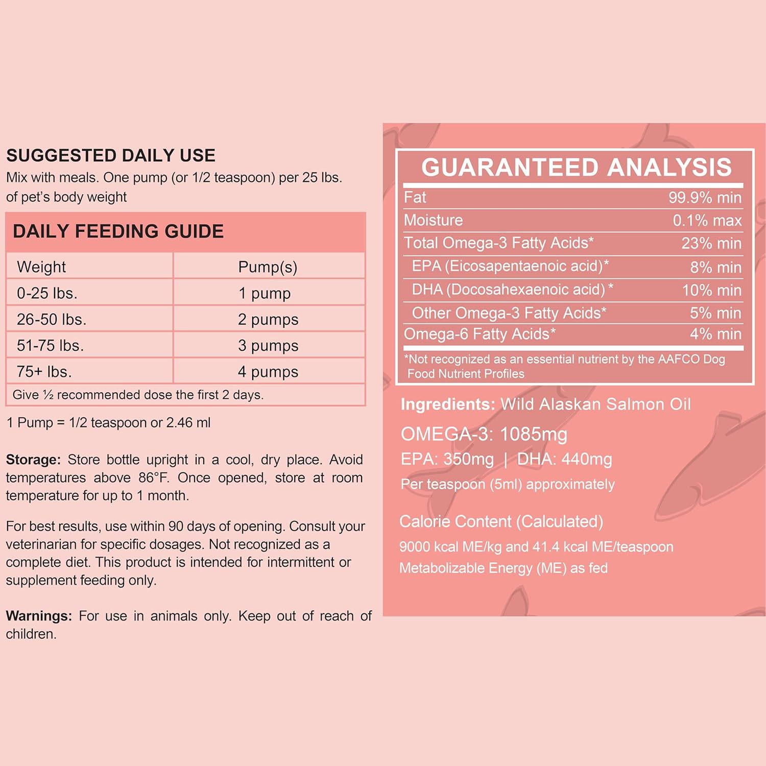 Made in America: This Wild Alaskan Salmon Oil is designed for small dogs, large dogs, even massive breeds! The oil adds a delicious flavor that your pet will love! Recommended dosage varies by animal size, consult the package.