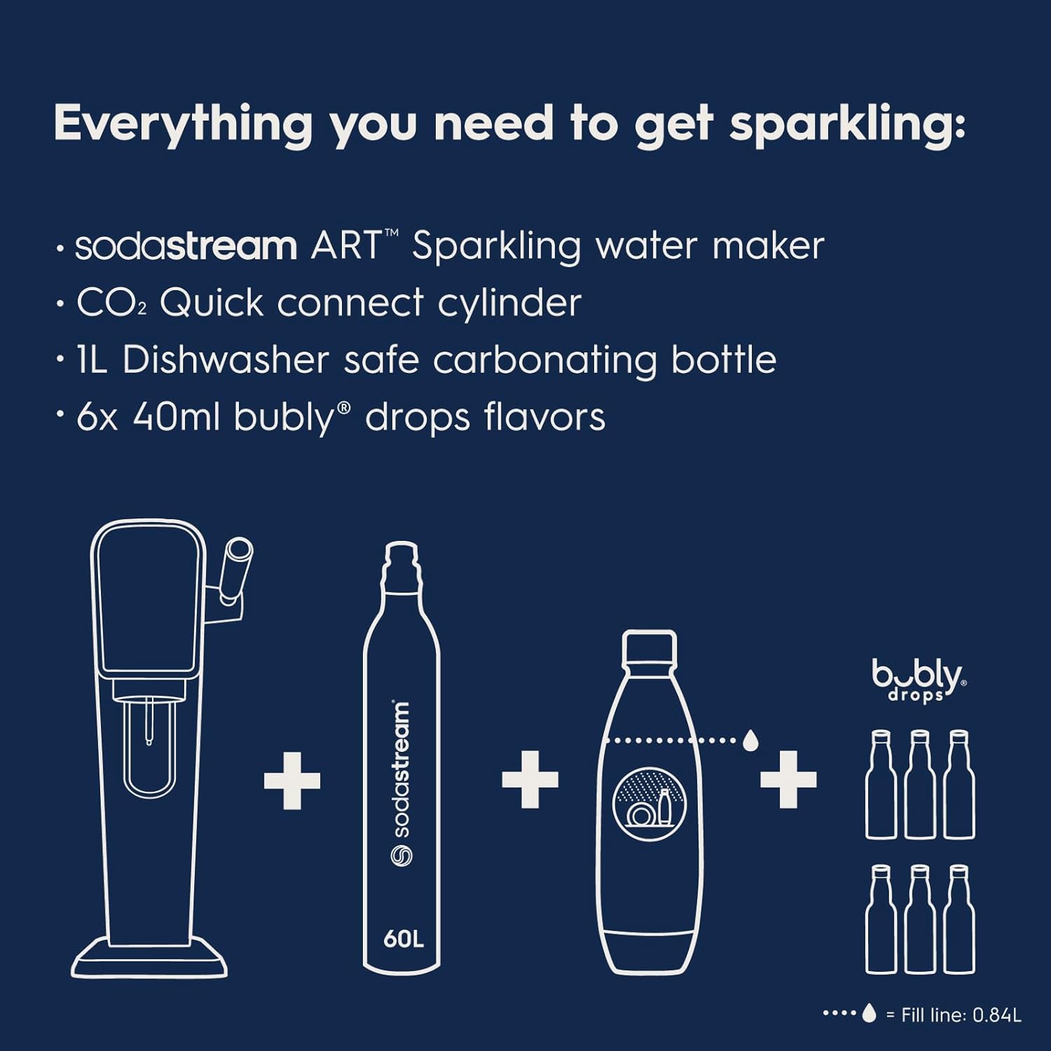 WHAT IS IN THE BUBLY FLAVOR BUNDLE: (1) SodaStream Art Sparkling water maker in black color, (1) 60L Co2 cylinder, (1) 1L BPA-Free Dishwasher safe reusable carbonating bottle, and (6) 40ml bubly drops flavors