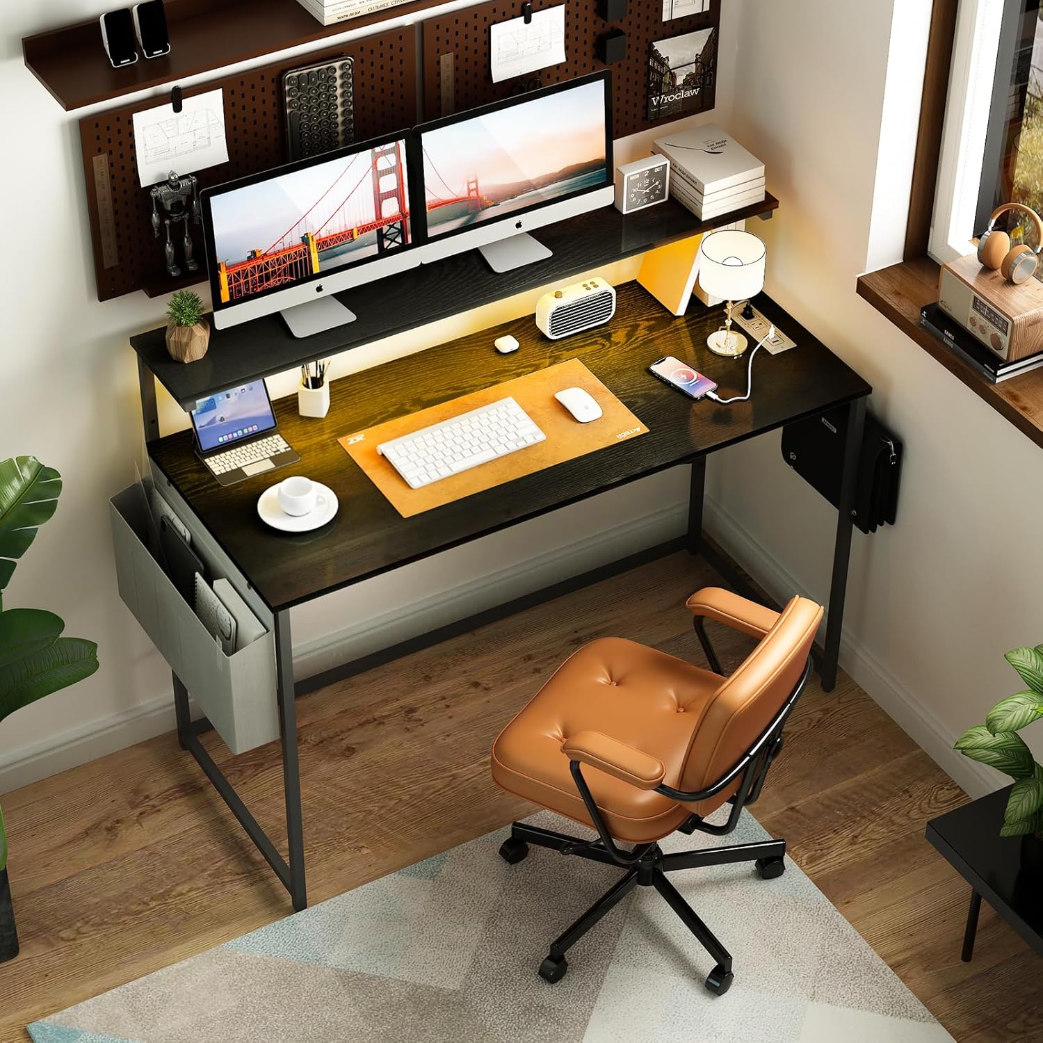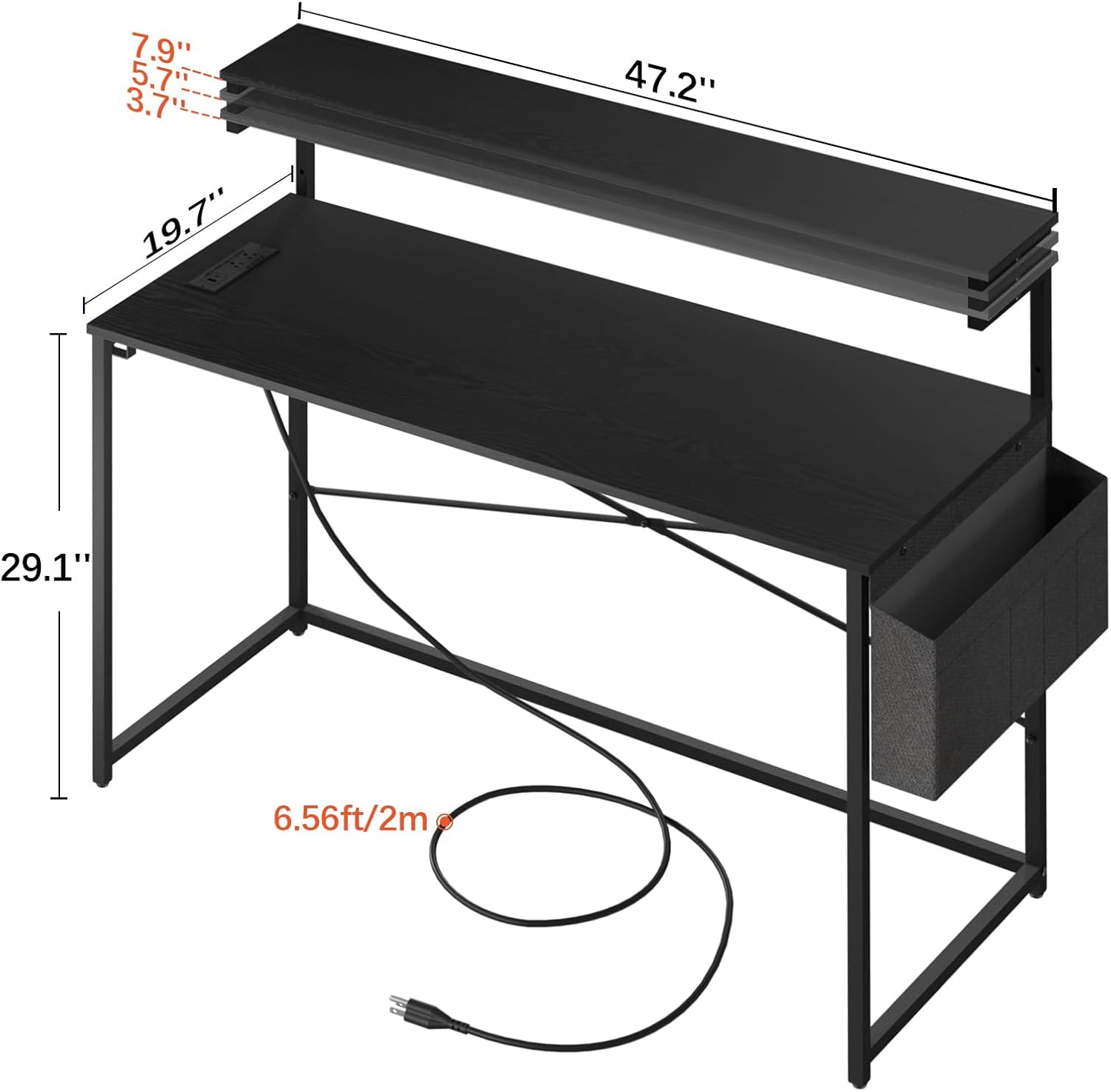 Yoobure Computer Desk with Power Outlets Fast Charging Type-C Included, Gaming Desk with LED Lights, 47″ Office Desk with Adjustable Monitor Stand, Small Desk Home Office Desks with Storage Bag & Hook
