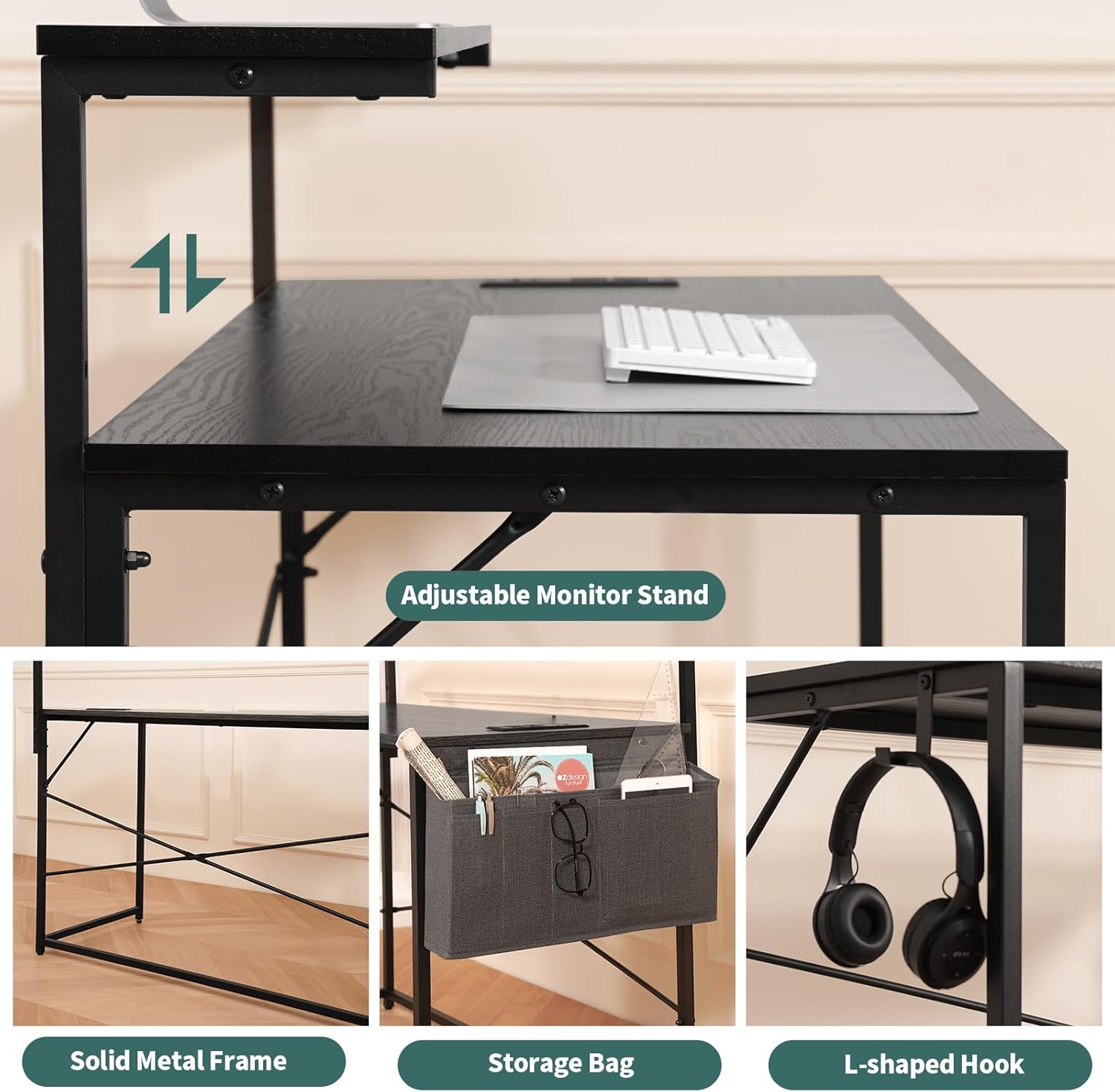 🎨【Thoughtful Design】Firstly, the adjustable 3-gear monitor stand (3.7″, 5.7″, 7.9″) boosts desktop storage and screen visibility. Secondly, we’ve ensured comfortable use by providing ample legroom. Finally, the side storage bag and hook cater to your storage needs for office supplies,headphones, etc.
