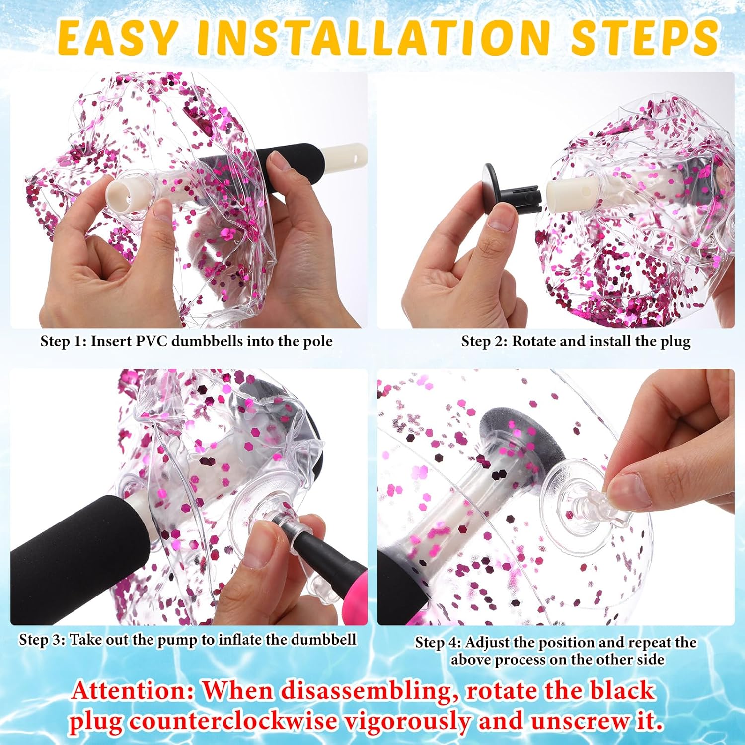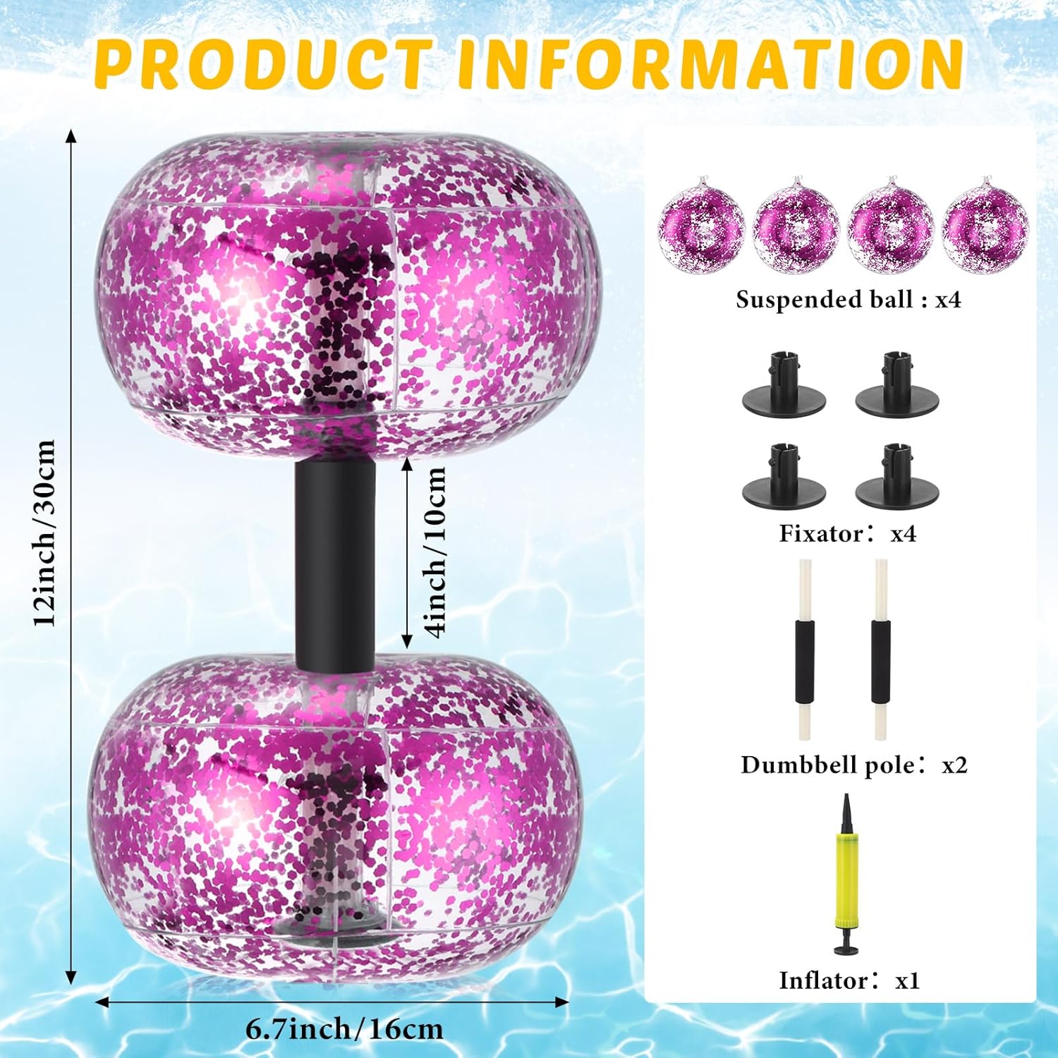Inflatable Aquatic Dumbbellthe dumbbell package includes 4 pieces of inflatable aquatic dumbbells, equipped with 2 pieces of plastic rods and a pump, which can be installed as a pair of dumbbells; This comprehensive set ensures you have what you need for a fulfilling and effective water based workout