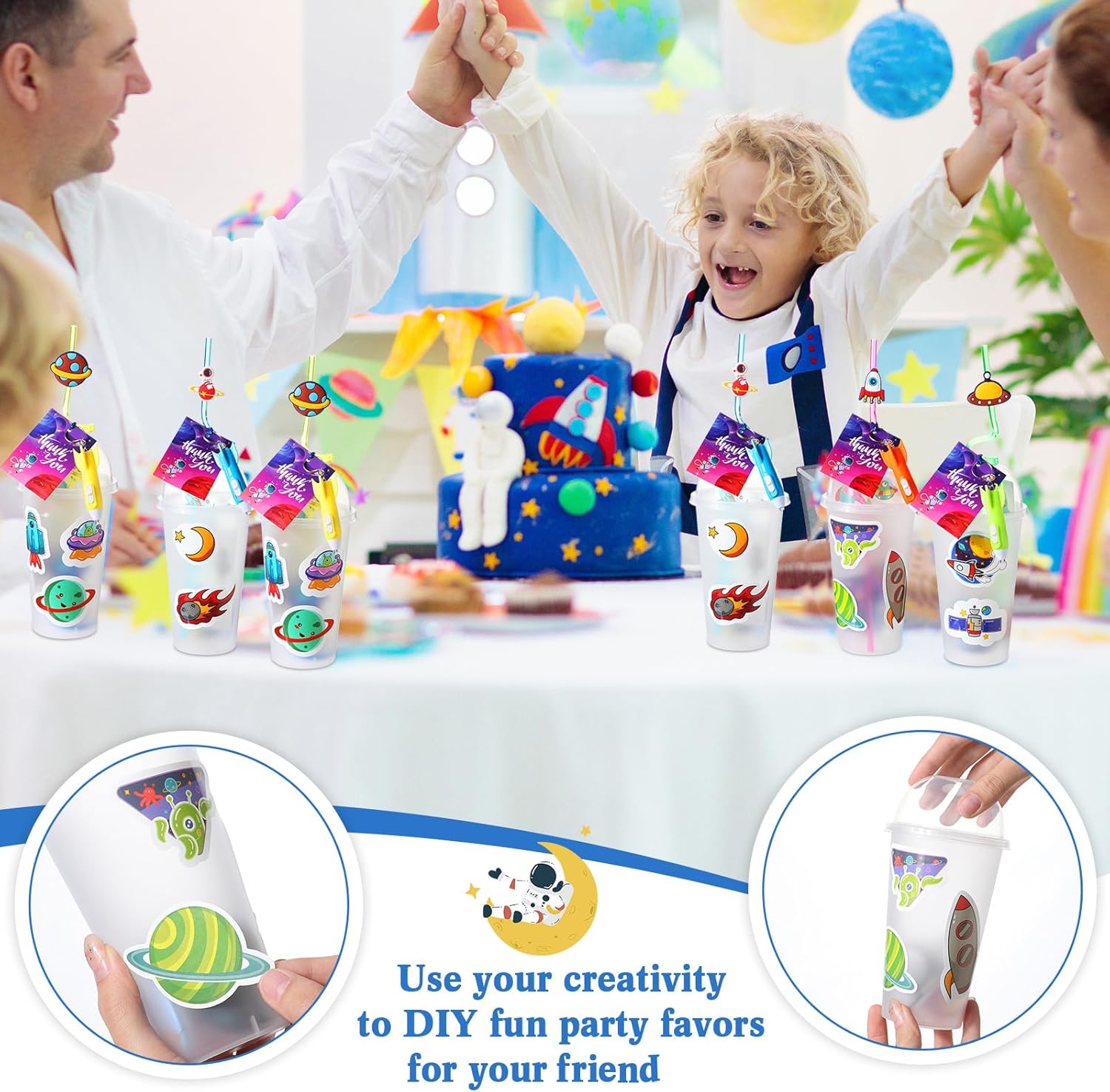 211 Pcs Space Party Favors with Gift Cup Space Tattoos Slap Bracelet Astronaut Straw Pendants Badges Stamp Keychains Bouncy Ball Thank You Cards for Boy Kid Space Galaxy Birthday Party Supplies