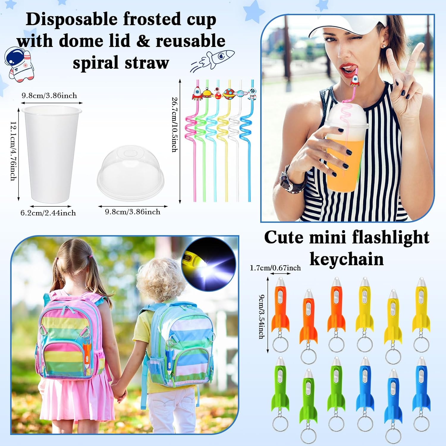 Impressive Array of Items: this space party favors set comes with an impressive variety of items; Ranging from pendants, key rings, wrist bands, badges, straws, to stickers, stamps, elastic balls, cups and lids, cards, packaging ties and more, this set provides everything you need to host an unforgettable space themed party