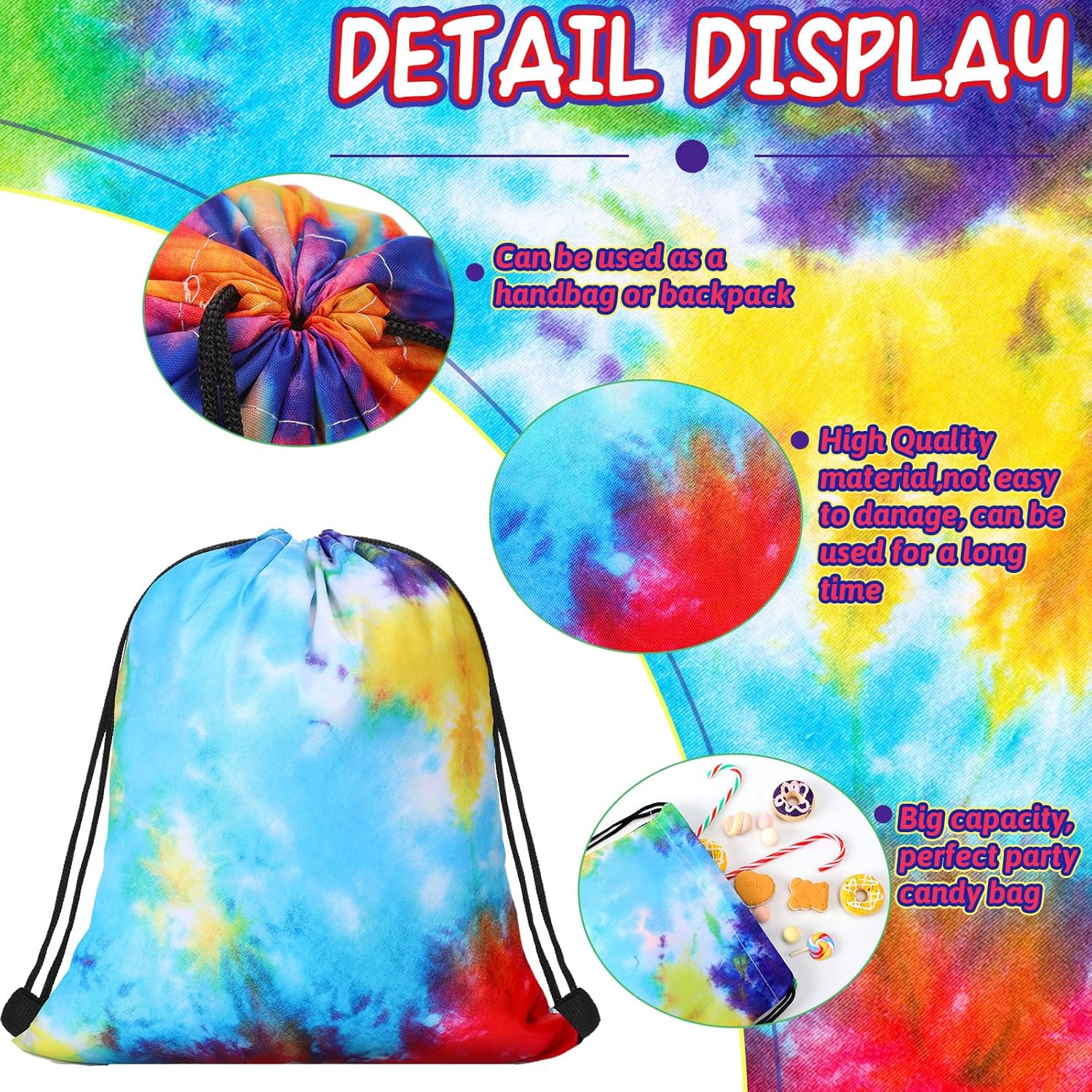 Spacious and Portable Sustained: made from quality polyester material, our tie dye bag is built to last; It is machine washable and resistant to wear and fading; With ample interior space, which measures about 11.81 x 9.84 inches, our tie dye draw string back bag can easily store snacks, small gifts, toys, candies, piecemeal goods, clothes and more; When not in use, it can be folded for portability and storage, making it convenient to take with you wherever you go