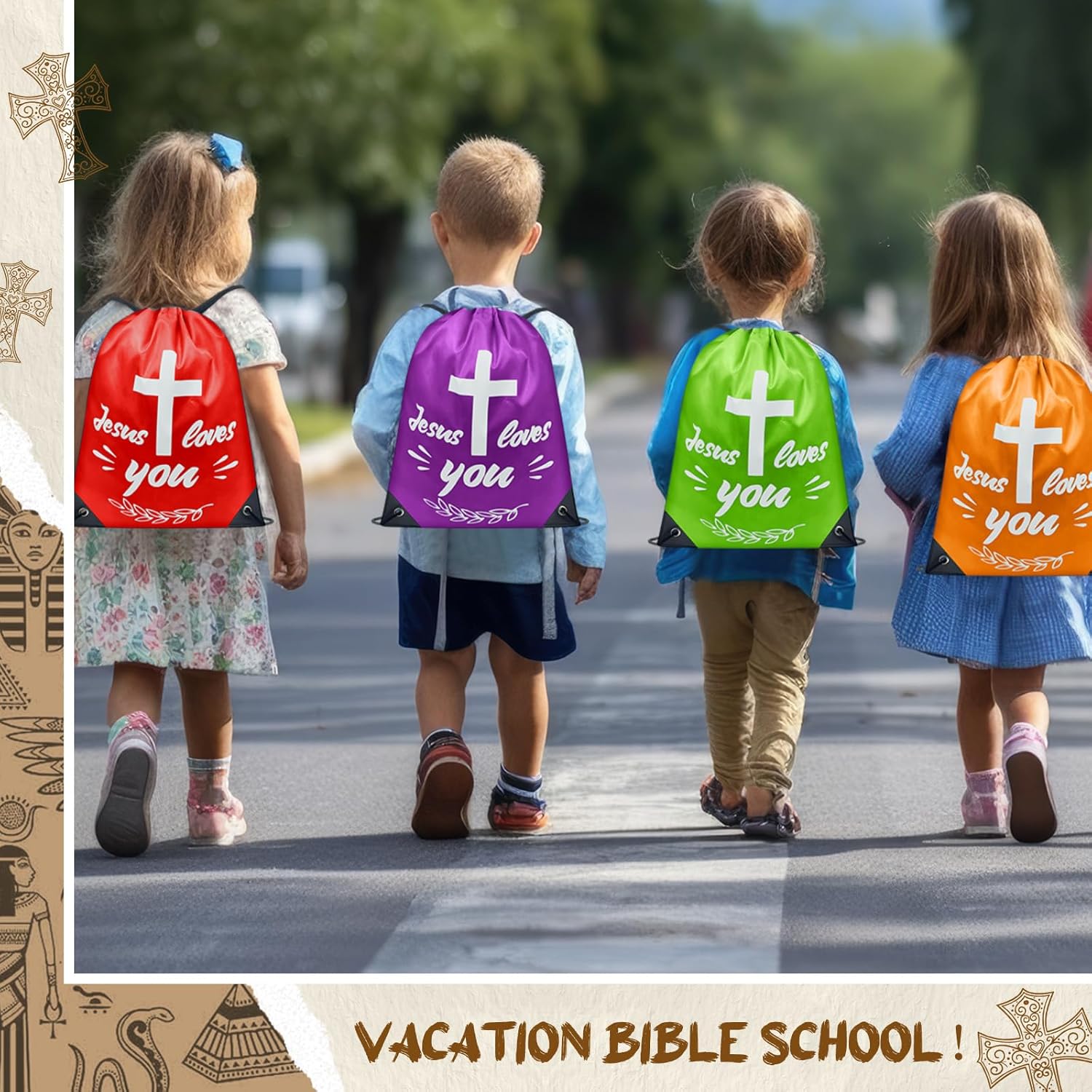 Bible Verse Party Favors: Our 48-piece set includes 16 Jesus Loves You drawstring backpacks, 16 Bible Verse bracelets, and 16 cross necklaces, making it the perfect choice for any religious event or celebration