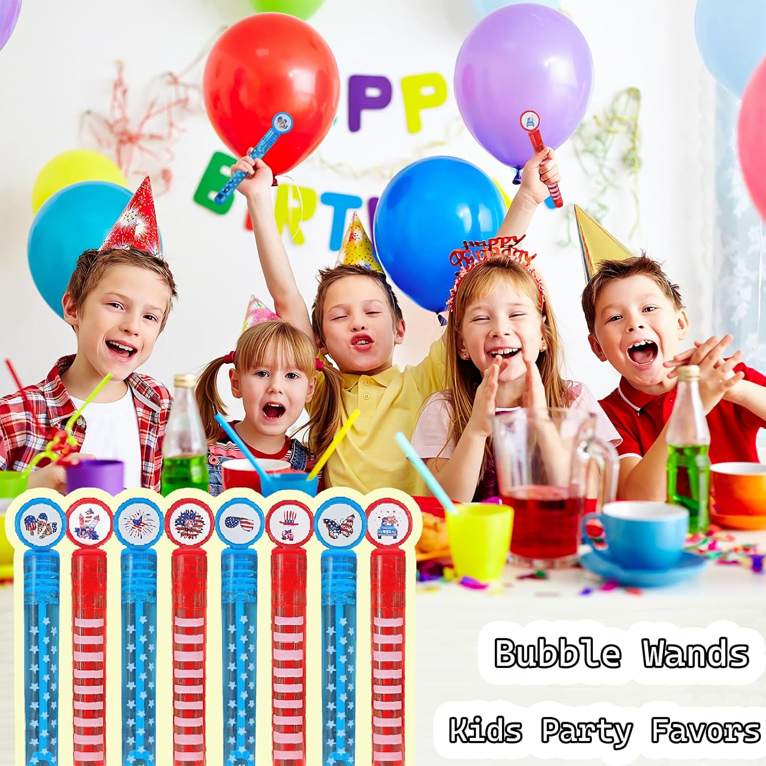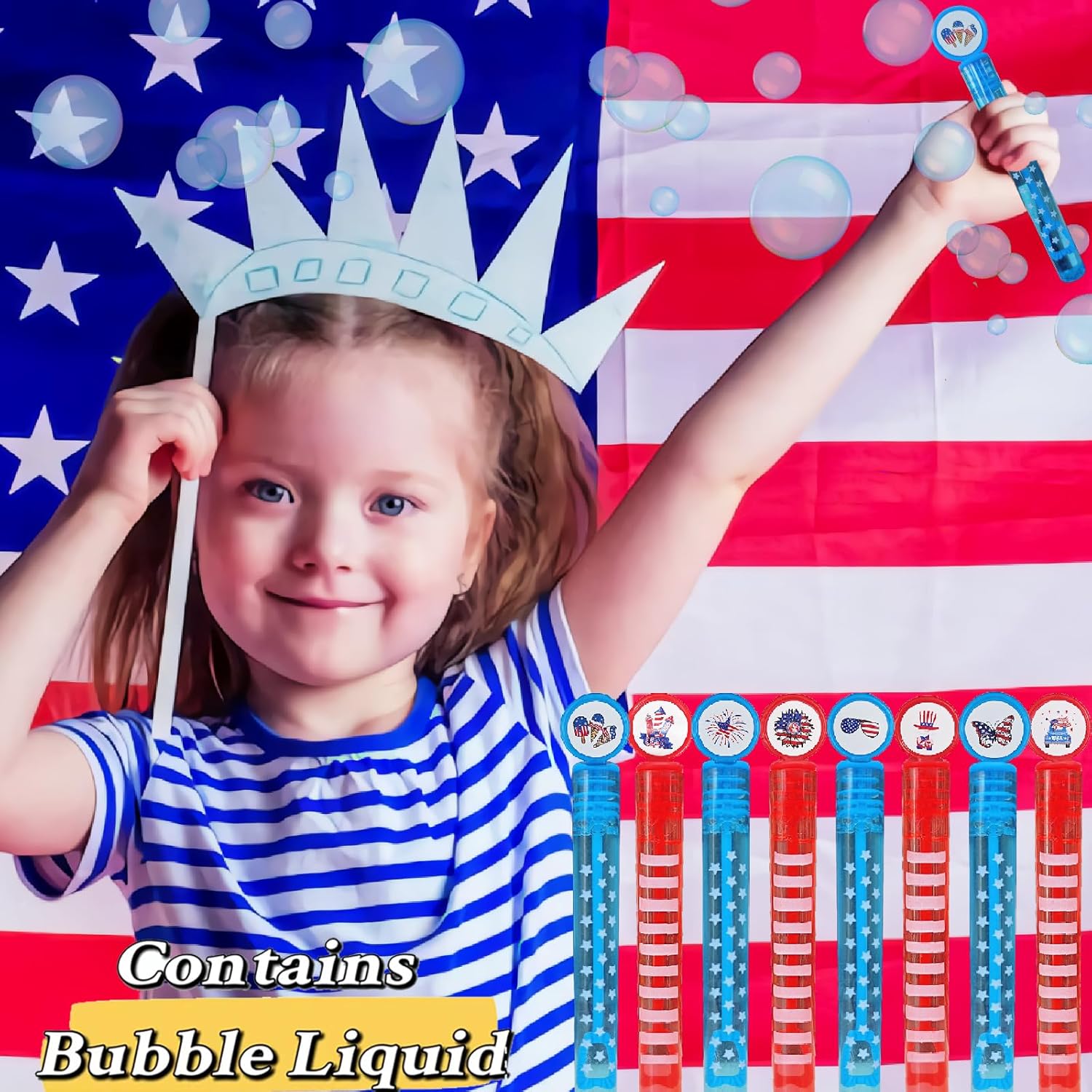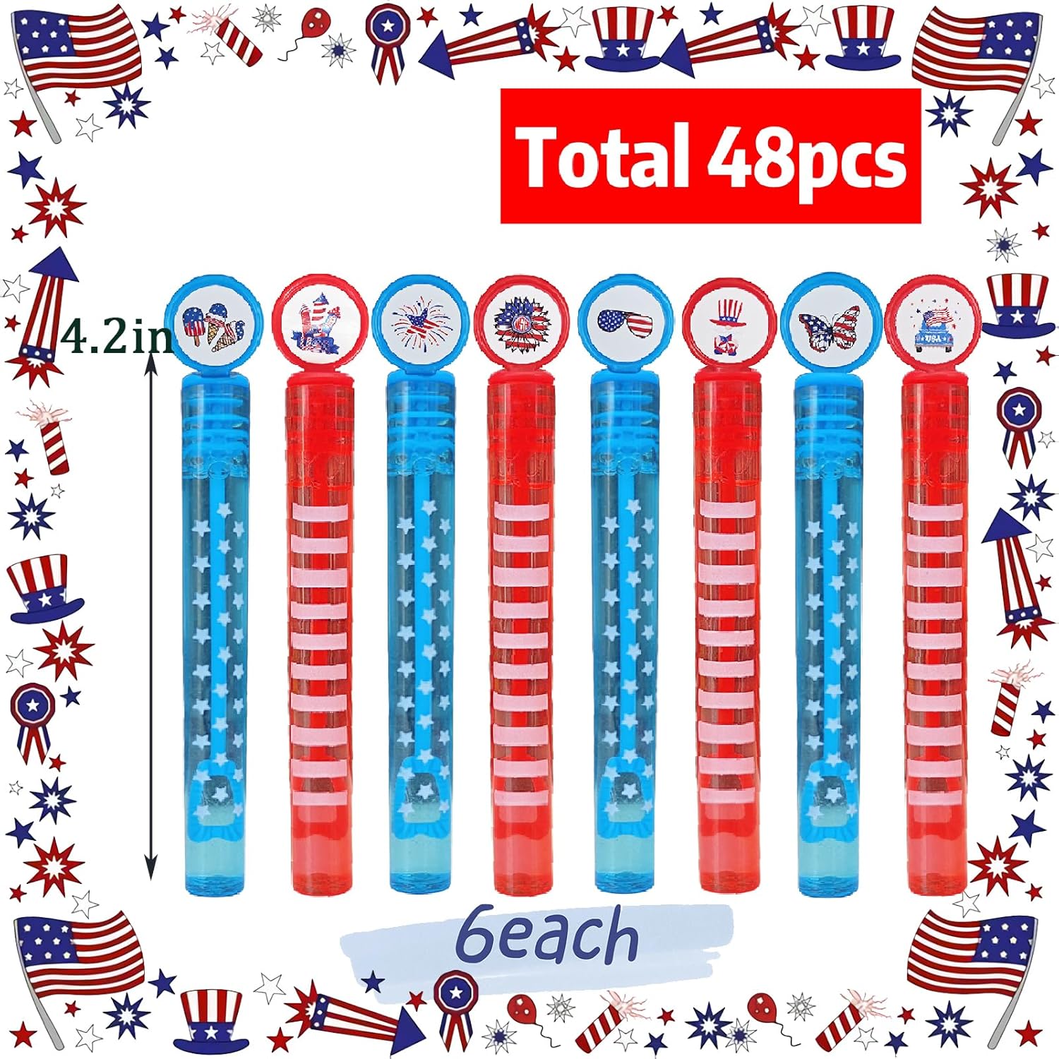 Product Design: The product is designed with 6 American flags patterns according to children’s preferences, each pattern is equipped with 8 bubbles, a total of 48 pack. 6 different creative design styles and rich color choices can meet the discerning needs of children.