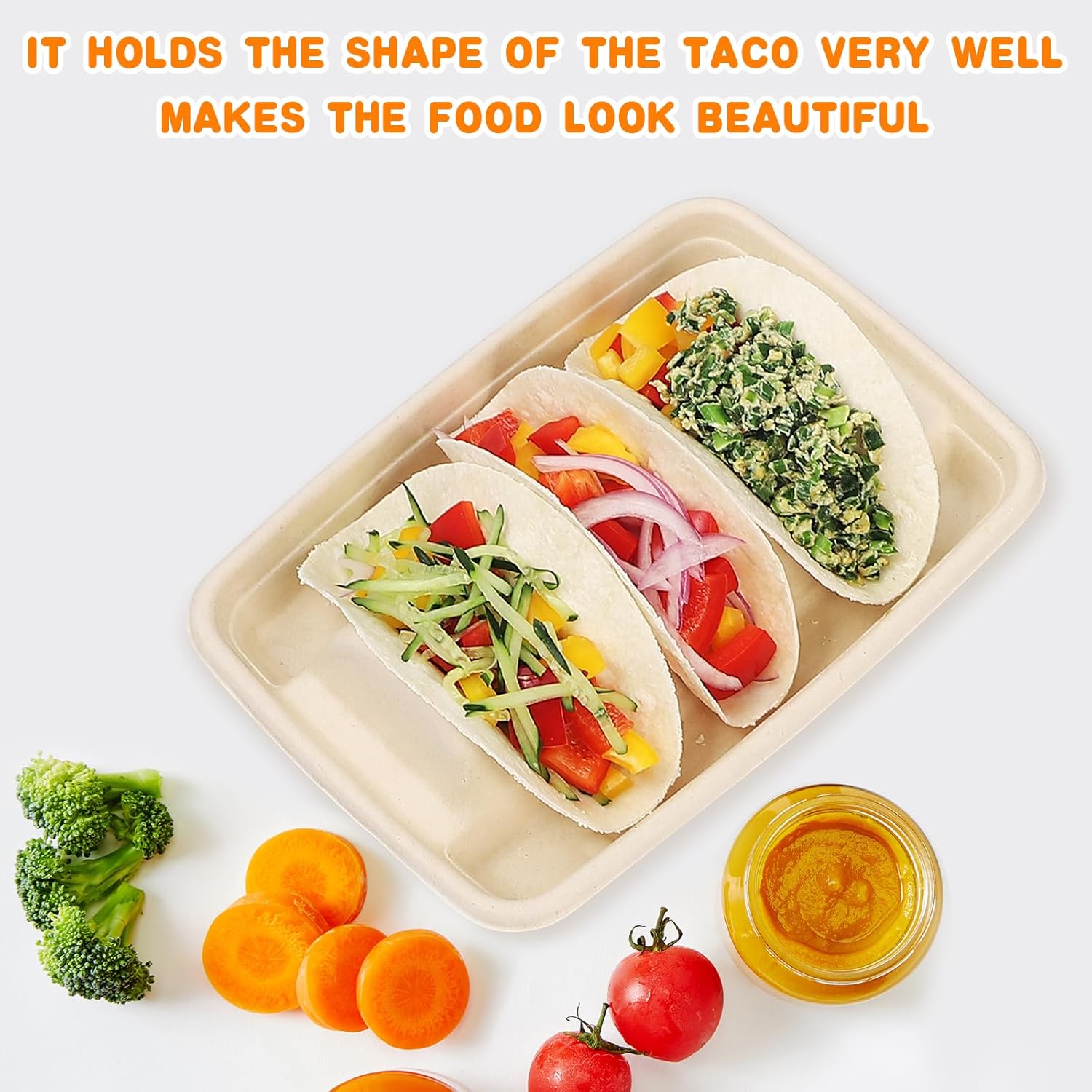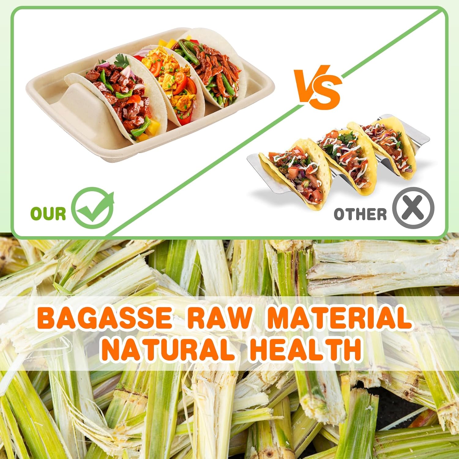 【Premium & Biodegradable】Made of high quality natural plant-based sugarcane pulp fiber, this disposable taco holders set is eco-friendly and biodegradable, BPA free, unbleached, sturdy and wear-resistant, which can be used as a taco holder with confidence.