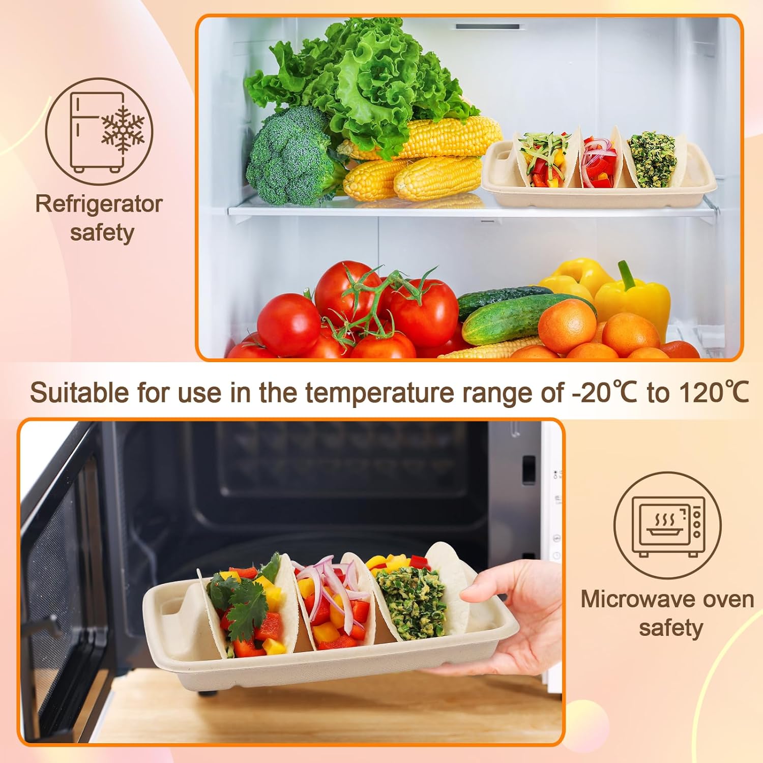 【3 Compartments & Easy to Use】Each taco holder disposable comes with 3 compartments to keep your tacos upright and ingredients neatly in place, ensuring easy assembly and preventing any fillings from falling out. This taco stand is suit for both soft and hard taco shells, and can be used in microwave, refrigerator and freezer.