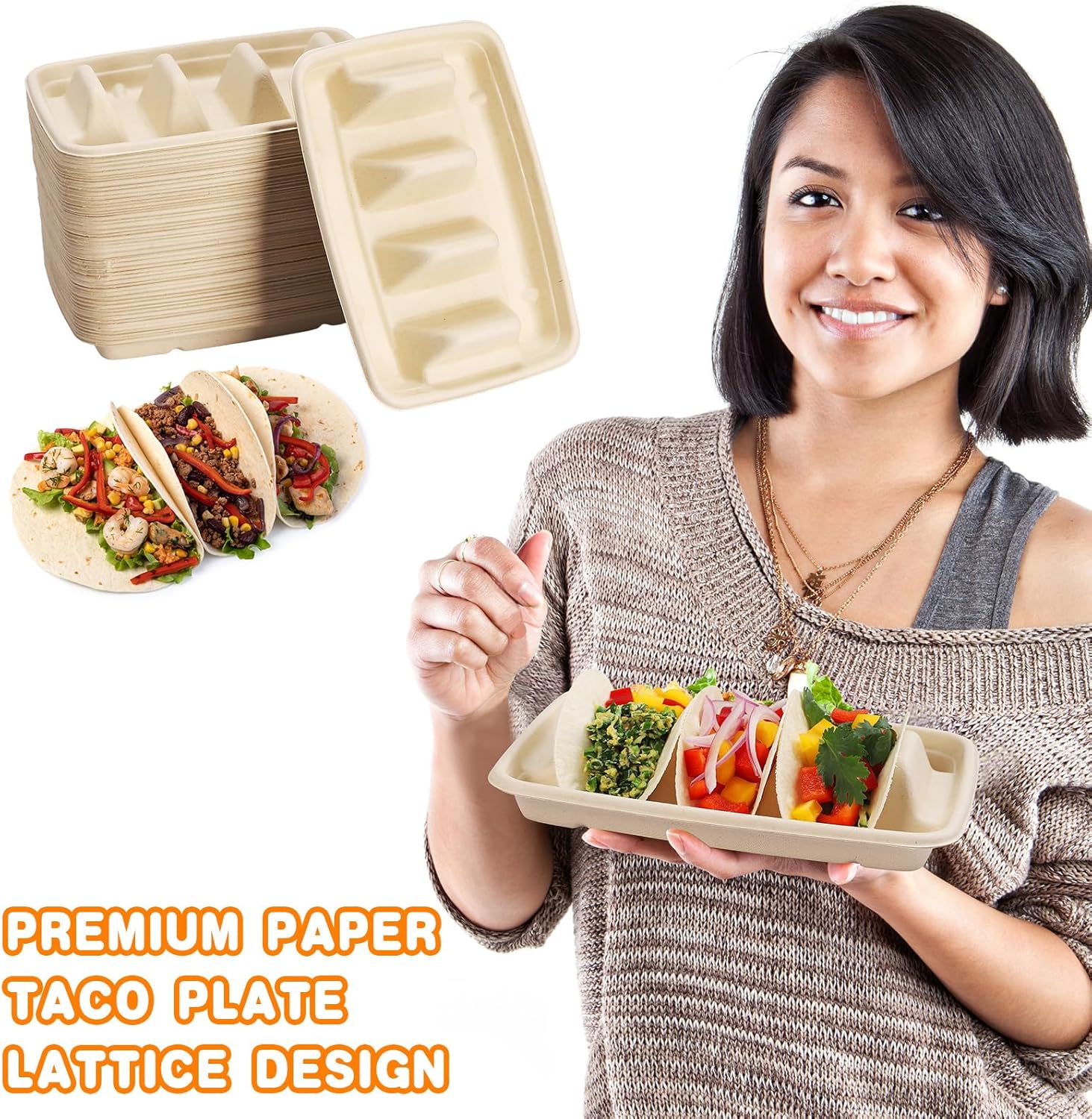 60 Pack Disposable Taco Holders, Premium Taco Holder Disposable Individual Biodegradable Taco Stand with 3 Compartments Paper Taco Plates Serving Set for Party Taco Tuesday Taco Bar (60)