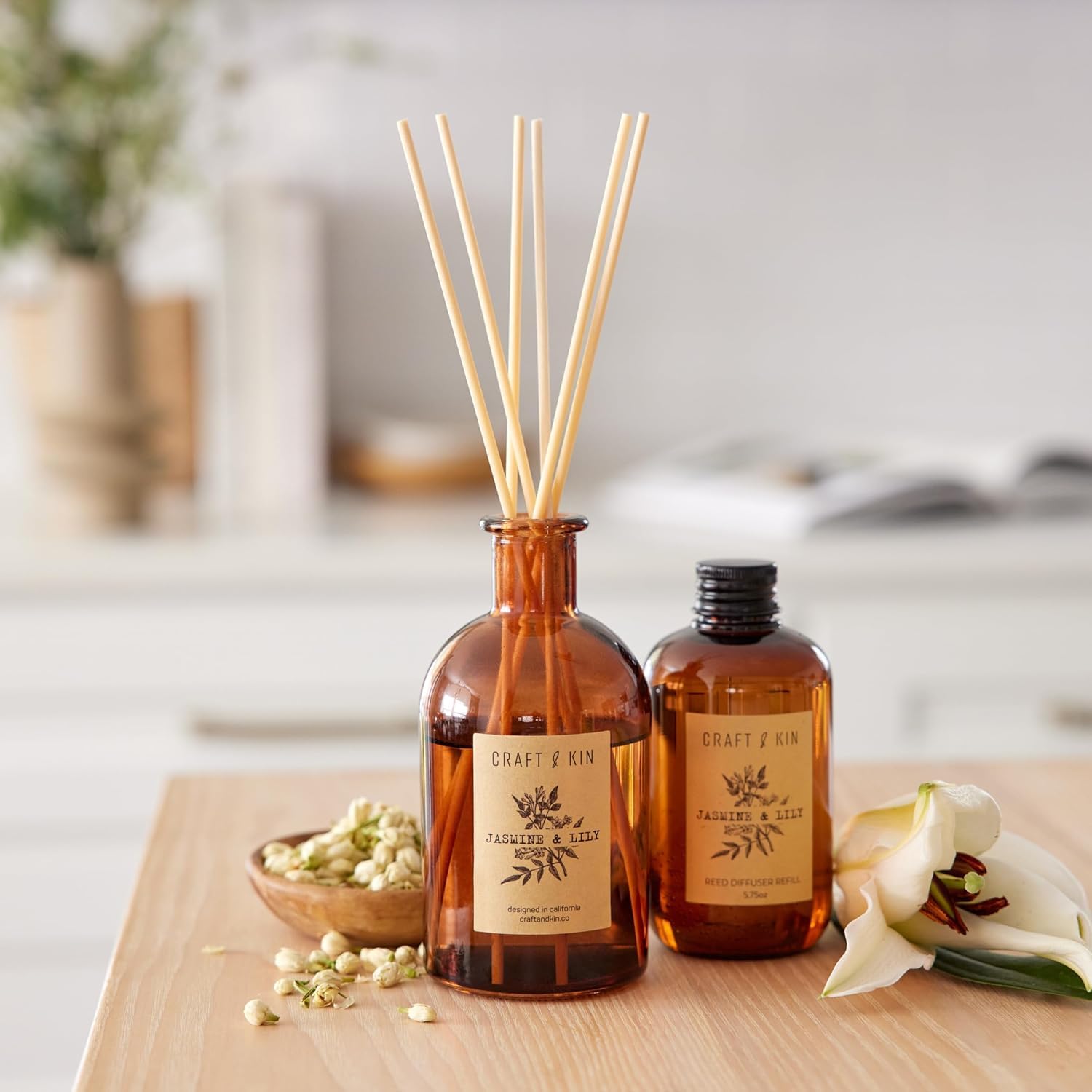 What You Get: Aromatic Reed Diffuser Set: Includes 8 rattan oil diffuser sticks, an elegant amber glass vase, and premium natural jasmine & lily essential oil mixture (5.75oz). Enjoy continuous fragrance for 90-120 days.