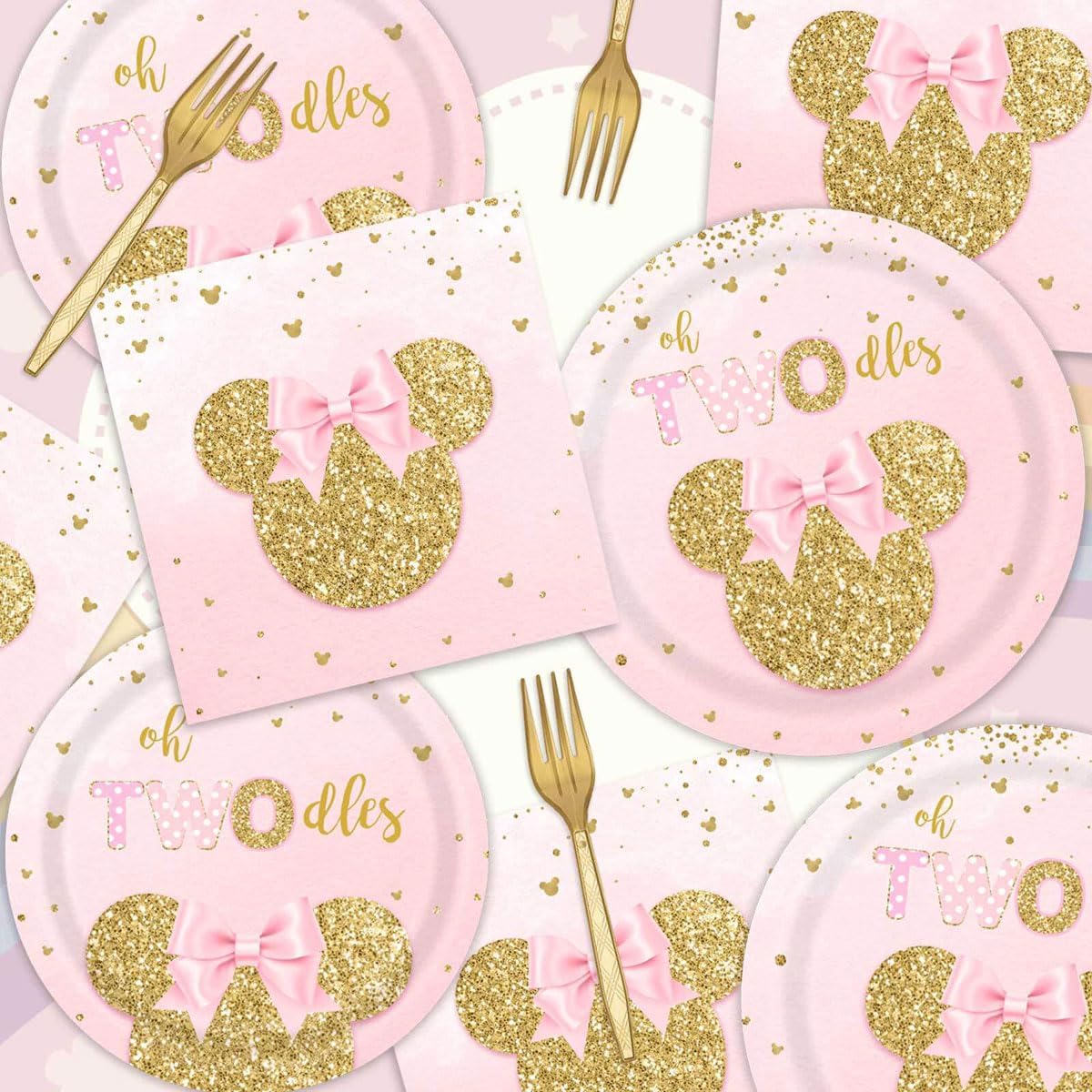 96 PCS Cartoon Mouse 2nd Plates and Napkins Party Supplies Girls Oh Twodles Mouse Happy 2nd Birthday Tableware Set Two Years Old Birthday Dinnerware Party Decorations Serve 24 Guests