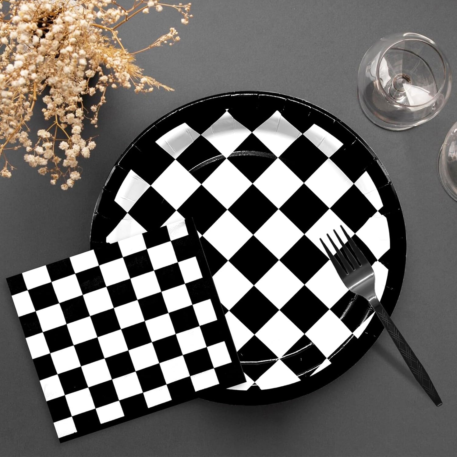 96 Pieces Racing Theme Party Supplies – Black and White Checkered Pattern Disposable Tableware with Paper Plates, Napkins, Forks for Race Car Dirt Bike Birthday Decorations, Sports Events Celebrations