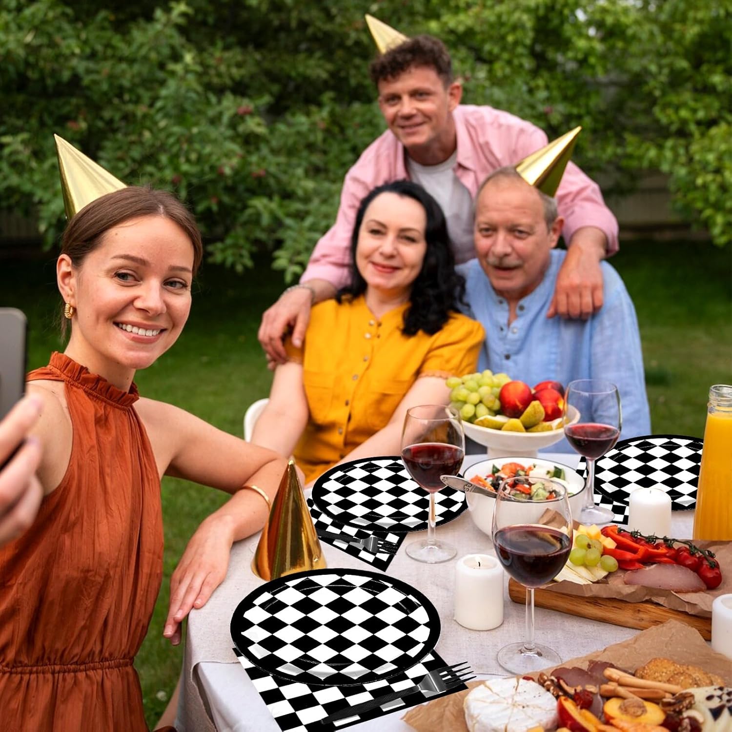 Racing Theme Design – Each item features a black and white checkered pattern, inspired by racing flags. This design adds a dynamic and festive touch to your gathering, perfect for race car or dirt bike birthday parties and sports events.