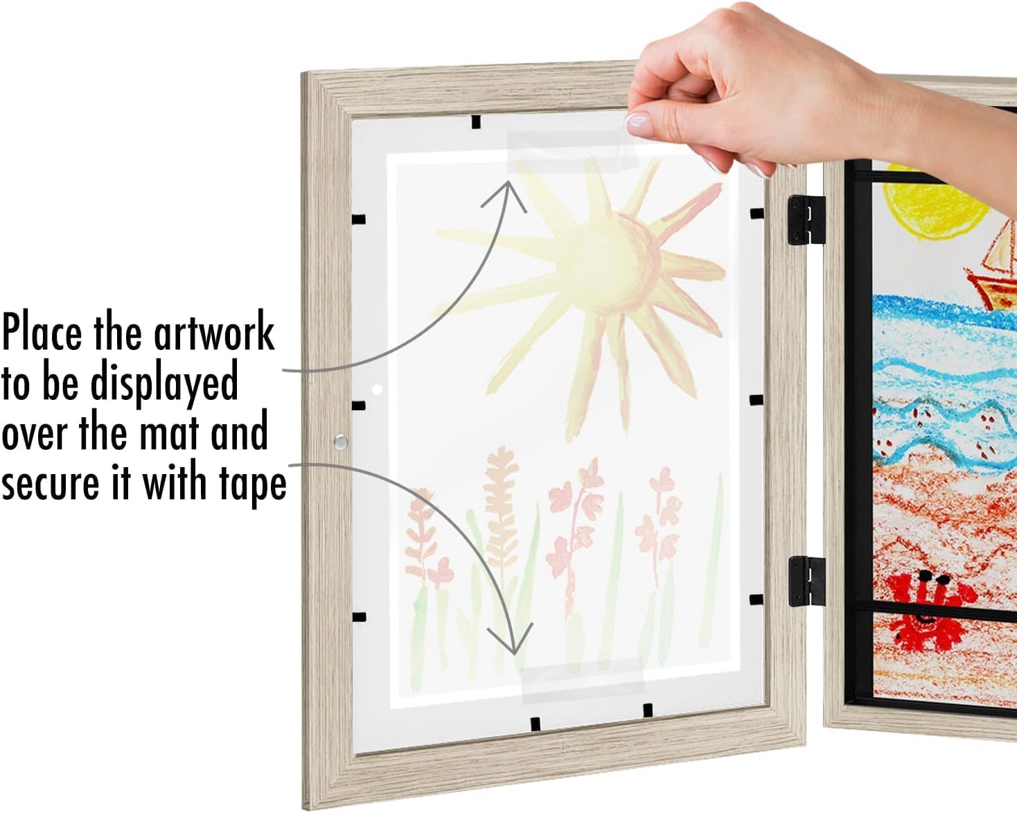 Introducing the Americanflat 10×12.5 kids art frame in driftwood, from the My Mini Masterpiece collection. A front-loading art frame for kids artwork designed to celebrate your child’s artistic journey. Crafted with precision and care, this kid art picture frame offers a seamless blend of functionality and style. Elevate your child’s masterpieces with this frame, meticulously engineered to hold 8.5×11 photos or art with the mat, or 10×12.5 without it. Its spacious display capacity of up to 100 pieces of artwork ensures that every stroke of creativity finds its place. Constructed with durable engineered wood molding, these artwork frames for kids art has a timeless design with a 2″ thickness. Its gallery style format, complete with built-in keyholes, allows for effortless wall display in both horizontal and vertical orientations, making these kids artwork frames changeable and a versatile addition to any space. Beyond its practicality, this frame serves as a heartfelt gift, perfect for parents or loved ones seeking to cherish precious memories. Whether it’s for Mother’s Day, Father’s Day, or birthdays, this frame adds a personal touch to any occasion. Experience the difference with Americanflat – where quality craftsmanship meets impeccable design. With our commitment to excellence and protective packaging, your picture frame arrives ready to preserve and showcase your child’s artistic journey.