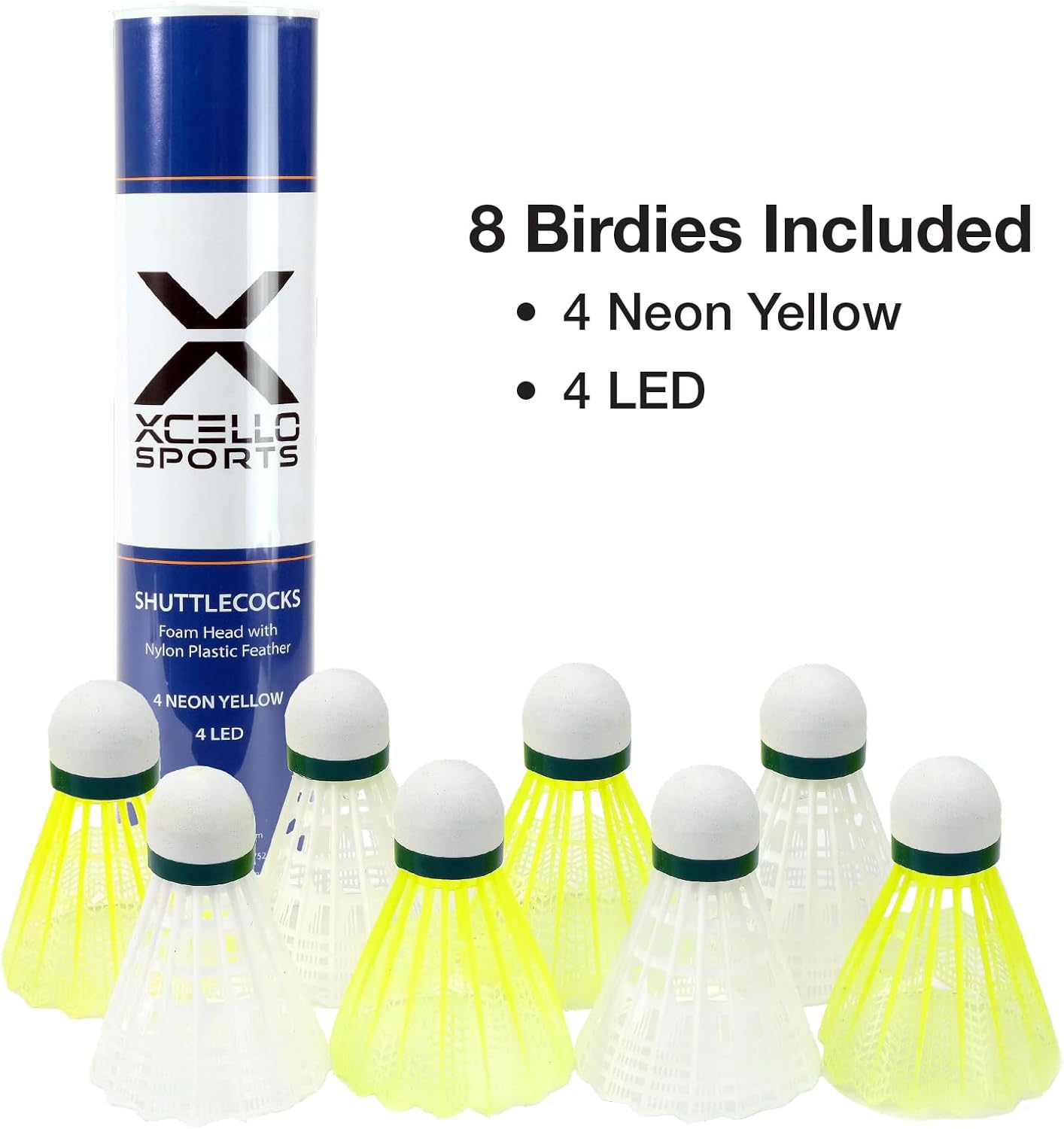 LED SHUTTLECOCKS – This Badminton set comes with 8 shuttlecocks, 4 are a vibrant neon yellow, perfect for daytime use. The other 4 shuttlecocks come with a built-in Green LED light, great for evening competition!
