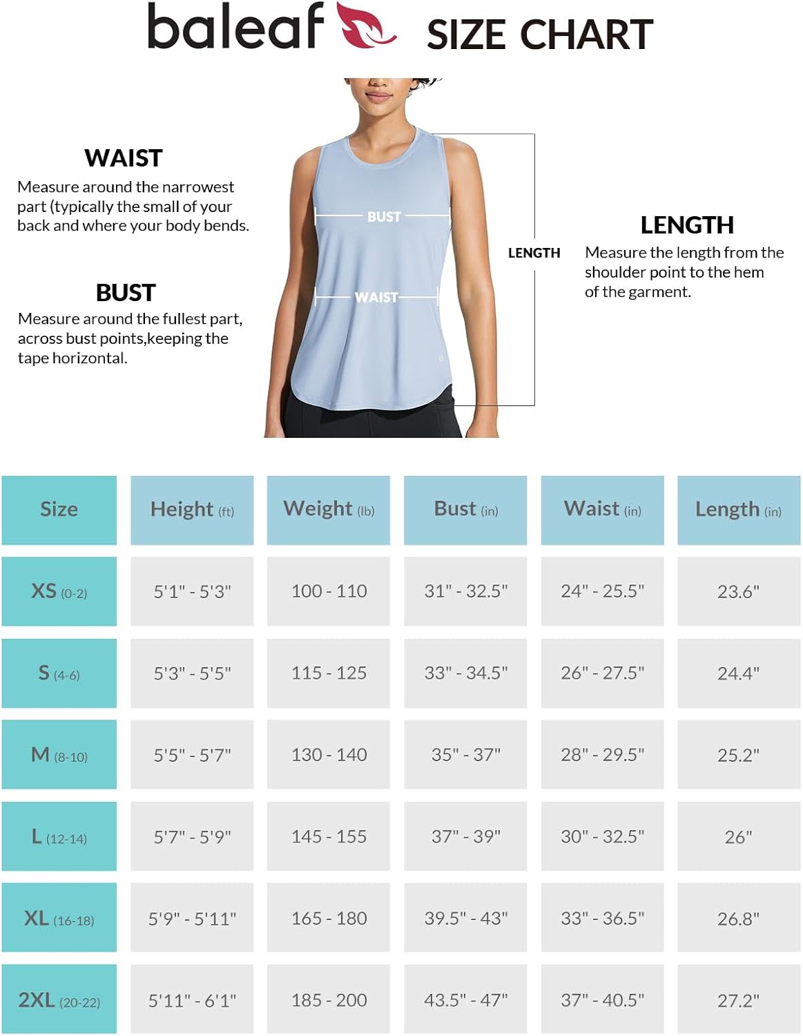 Ultra soft polyester and spandex fabric, naturally breathable, lightweight, quick dry, stretchy and comfortable to wear. BALEAF athletic tank tops are designed for yoga, exercise, fitness, gym, running, any type of workout or everyday use. They combine fashion, function and performance.