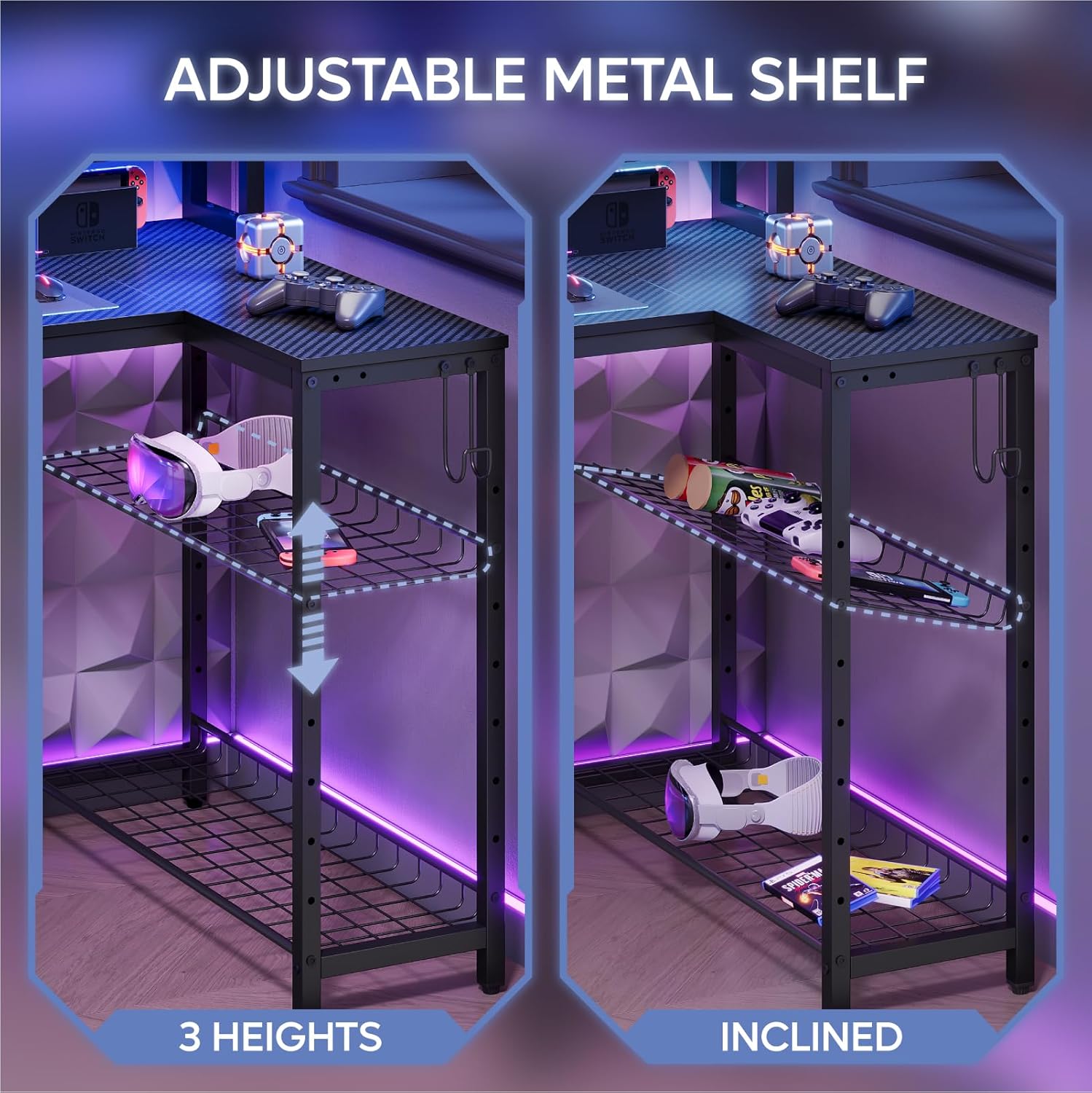 【Gaming Command Center】This gaming computer desk features a adjustable metal shelf that can be adjusted to over 3 different heights and tilted to your preferred angle. Foldable cup holder and headphone hook offer 3 installation positions, the storage racks can hold your PC, PS5 or Xbox. This black table is a strategic gaming hub designed to adapt to your needs, maximize gaming space, and enhance your gaming experience.