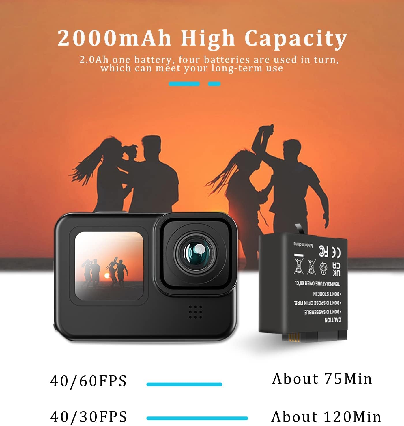Our replacement for Gopro Hero 8/7/6/5 battery uses high-quality and stable current battery material, to provide you with a larger capacity and stable battery. Equipped with 4 batteries at the same time, greatly extending your shooting time