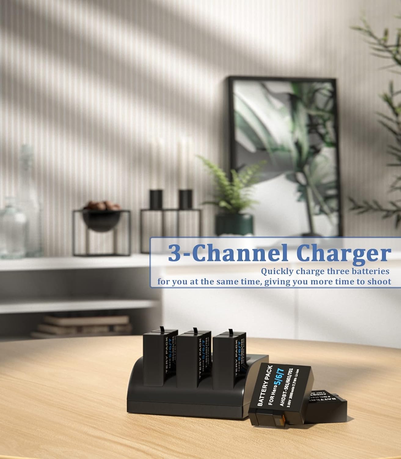 【3-CHANNEL CHARGER AND BATTERY BUNDLE】While using the camera, the other two batteries can be charged on the Gopro Hero 7 black battery charger at the same time, which can extend your shooting time for a long time. There is a charging status display on the Gopro Hero 7 battery charger, the red light means charging, and the green light means charging is complete
