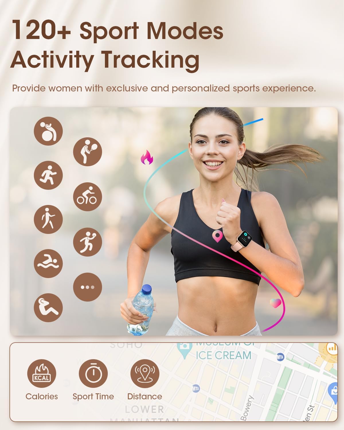 🏆【Perfect Figure, Perfect Women】The fitness watch for women has built-in 120+ sports modes, which can track and record your heart rate, distance, steps and calories in real time during your running, cycling, yoga and other sports. The women fitness tracker also can set sport goals to make your exercise more motivated and effective. It is your best companion during exercise and fitness. Note: This sport watch can obtain GPS positioning through your mobile phone and clearly upload your movement path.