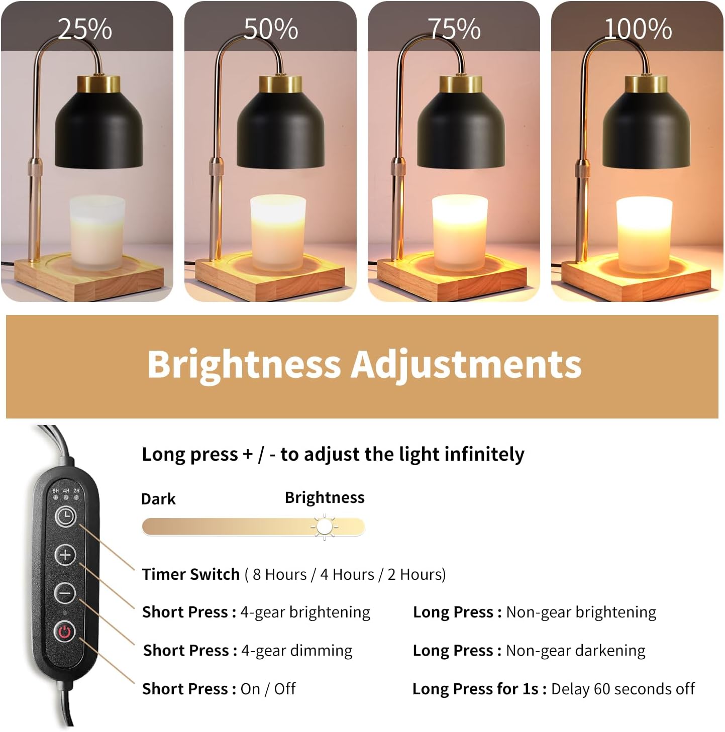Timer and Dimming Function: Candle warmer lamp with timer and dimming functions to meet your personalized needs. You can choose from 2H/4H/8H timer settings, as well as four different dimming options, allowing you to adjust the light’s brightness for various occasions and moods.