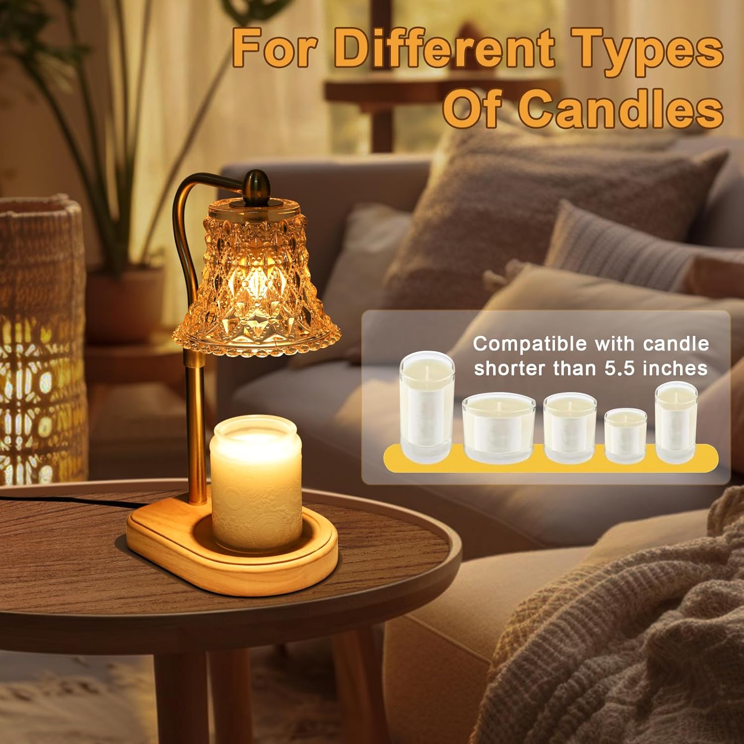 【INFINITE DIMMING & HEIGHT CUSTOMIZATION】- The Candle Warmer features a step-less dimming function, allowing you to seamlessly adjust the brightness of the bulb. By simply turning the knob, the maximum adjustable height is approximately 12 inches, suitable for a variety of scented candles in the market,height range approximately: 2.8″-5.6″. . Control the light intensity and regulate the candle melting speed for your desired scent strength. Higher brightness accelerates melting, ensuring a longer lifespan compared to burning, translating to cost savings on candles.