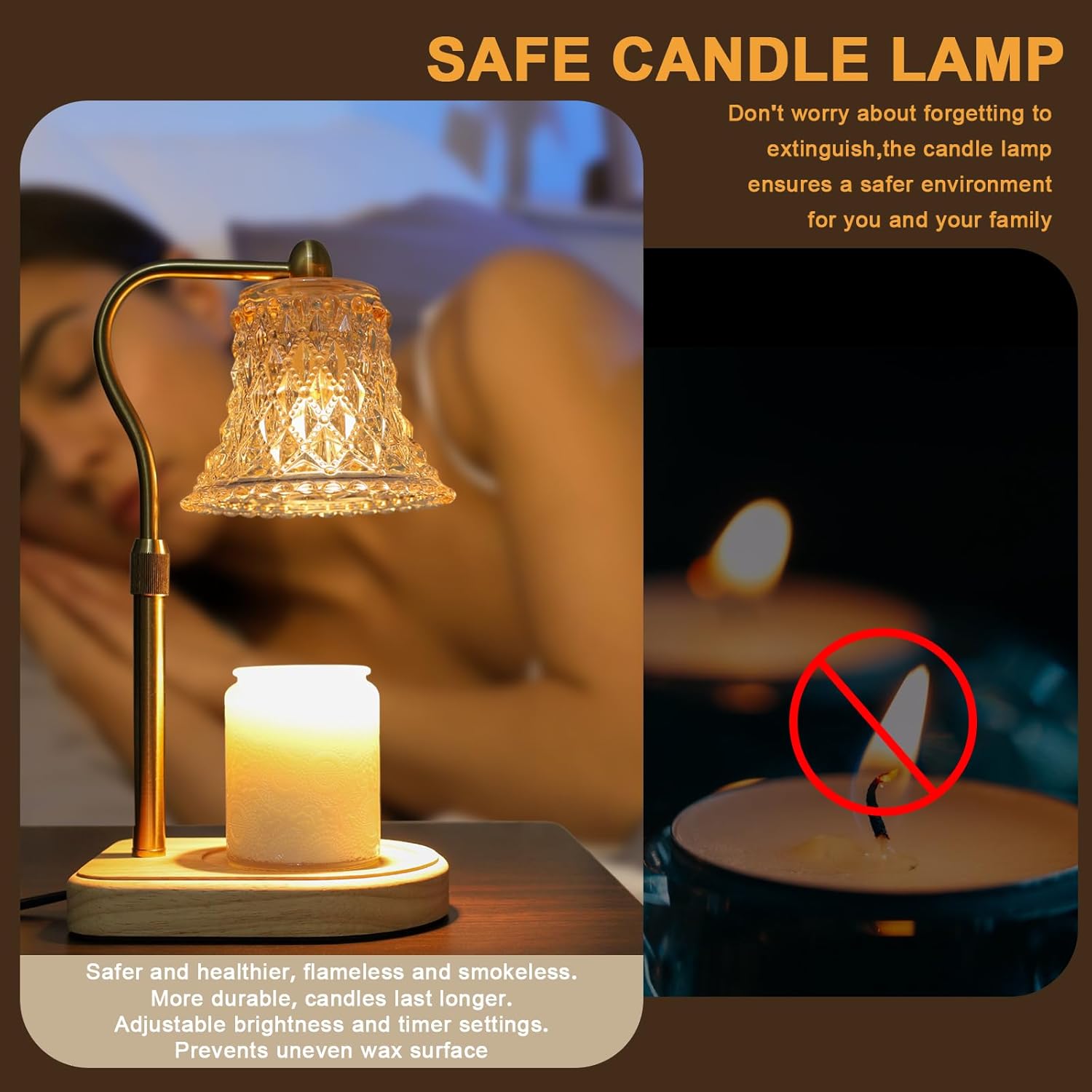 【2/4/8-HOUR TIMER FOR ADDED SAFETY】- Equipped with two 50W halogen warming bulbs (included), the candle warmer lamp offers a secure and eco-friendly way to enjoy candles. Eliminate open flames, smoke, soot, and pollution, minimizing the risk of fire. Bid farewell to candle flames, smoke, and soot, as the candle lamp warmer delivers a cleaner and more efficient alternative. A perfect choice for both sustainability and safety.