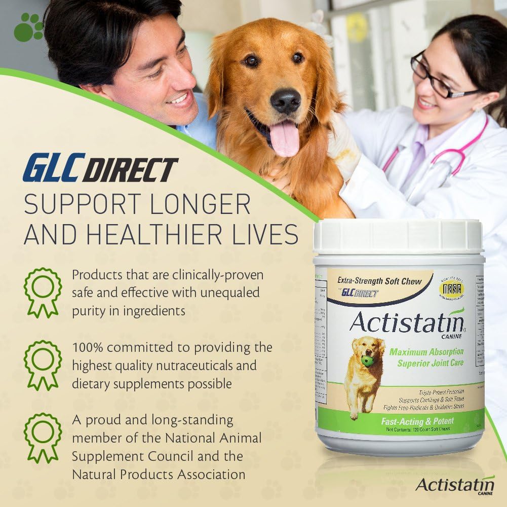 Delicious, easy-to-give soft chews for dogs – Our Actistatin canine large dog soft chews have the highest absorption in the industry to help naturally support your dog’s healthy joints, cartilage and soft tissue. Each delicious soft chew contains an advanced, triple-patented formula that includes Glucosamine, Chondroitin, Manganese and MSM (methylsulfonylmethane) – plus antioxidants, free-radical fighters, beneficial fatty acids and more – for superior joint function and health.