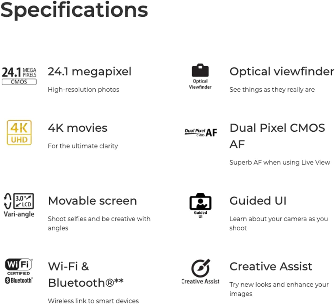Both a 24.1MP APS-C CMOS sensor and DIGIC 8 image processor are used to deliver high sensitivity and fast camera performance to suit both stills and video applications. A flexible native ISO 100-25600 range suits working in a variety of lighting conditions, and the processing capabilities minimize noise for notable clarity. The processor also enables up to 5 fps continuous shooting as well as UHD 4K video recording and a 4K time-lapse movie mode.
