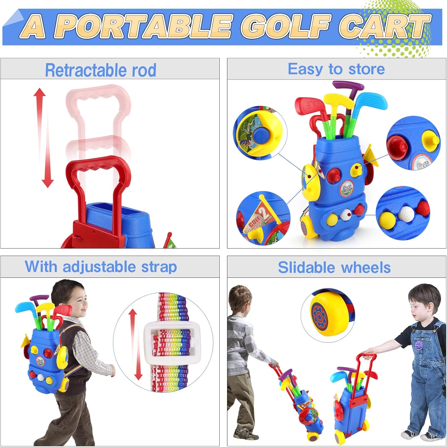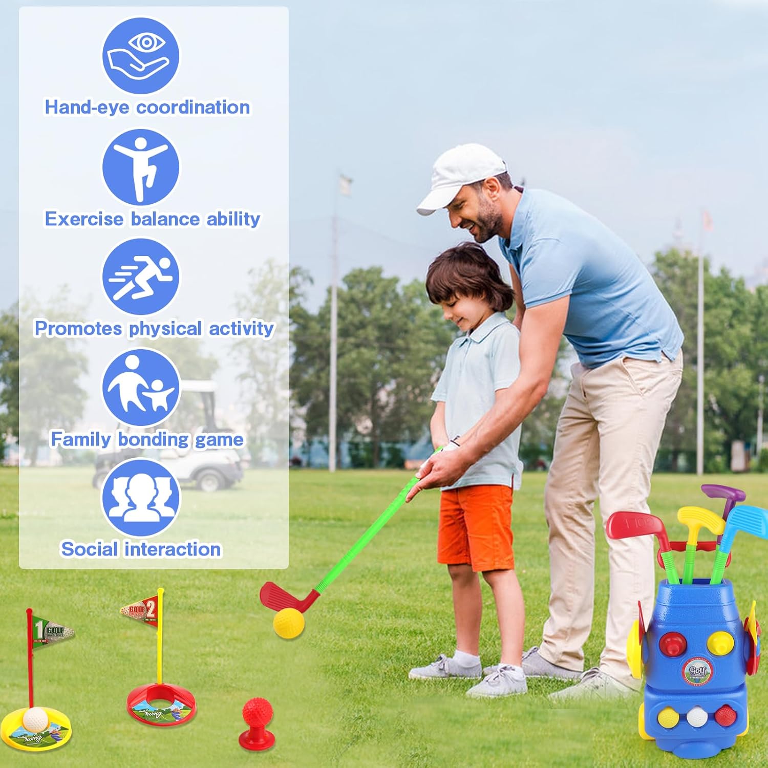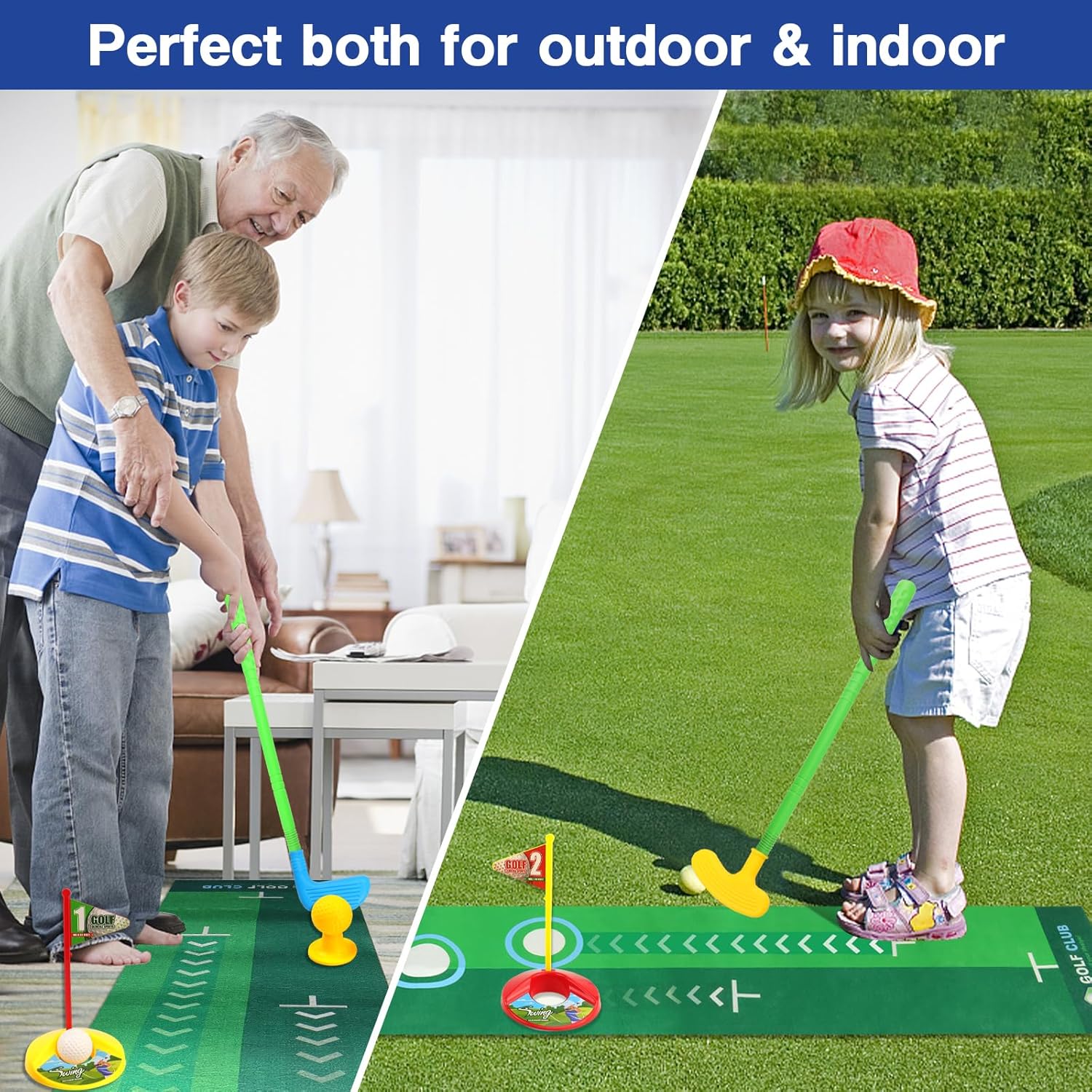 Safety is our top priority. These toy golf sets are made of high-quality and non-toxic materials that are safe and durable for kids to use.All golf paly set withstand the rigors of young golfers’ swings and hits, ensuring long-lasting use.