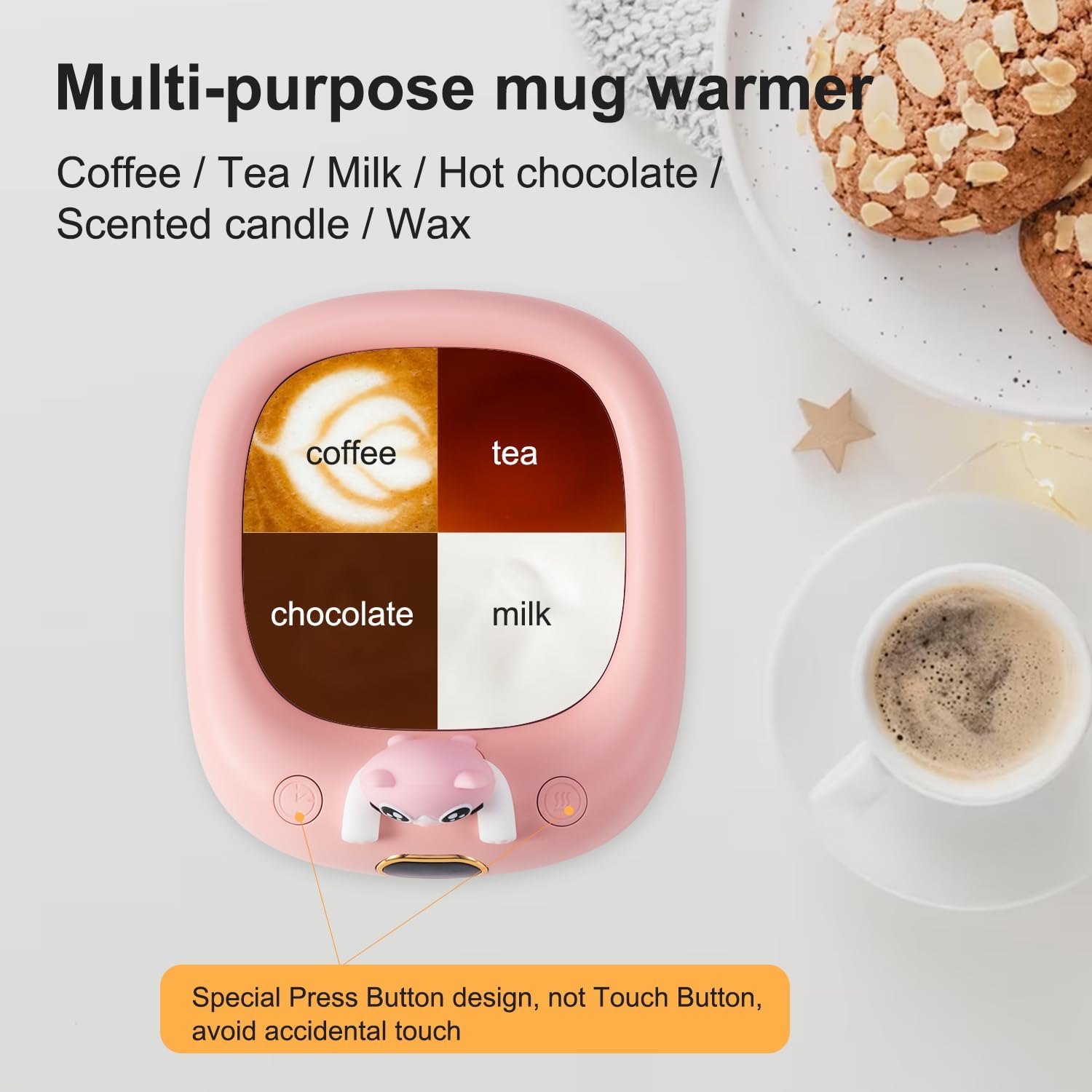 ☕【3.5×3.5″ Large Heating Plate】Oversized base to fit for most mugs (NOT fits for plastic cups), glass cups, stainless steel cups and baby bottles, even used as a candle warmer to fill your room with fragrance. Those cups with a thin-walled, flat bottom is recommended to use for better heating results.