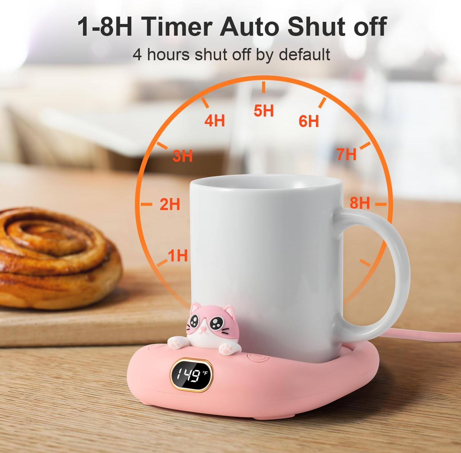 8 Timing auto shut off functions (1H-8H), 4H auto shut off by defauct.Three temperature settings select (113° F/131° F/149° F), keep your drink warm enough.Enjoy hot tea or coffee anytime without the trouble of taking frequent trips to the microwave.