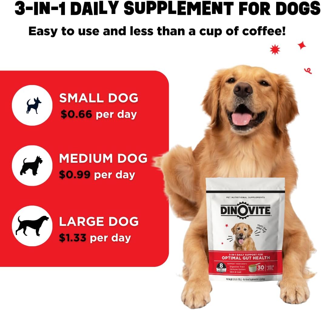 Dinovite Probiotic Supplement for Dogs – Omega 3 for Dogs – Hot Spot Relief – Skin & Coat Supplement for Dogs – 30 Day Supply (30 Day Supply, Medium Dogs (18-45 lbs))