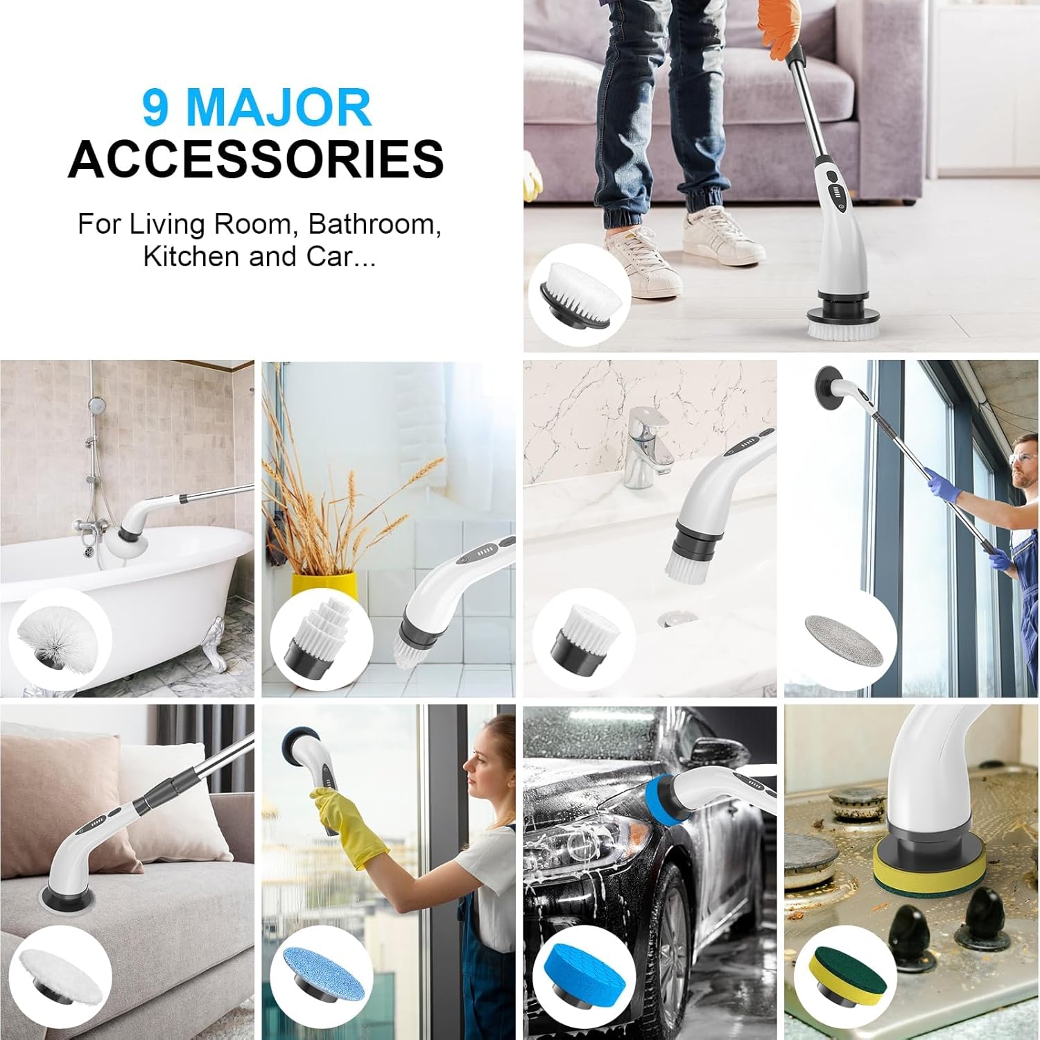 Reach Every Corner: The shower cleaner designed with a powerful rotating brush head, With a variety of brush heads and attachments, our bathroom cleaner is suitable for various cleaning tasks, including bathrooms, kitchens, floors, and more. One product, multiple applications.