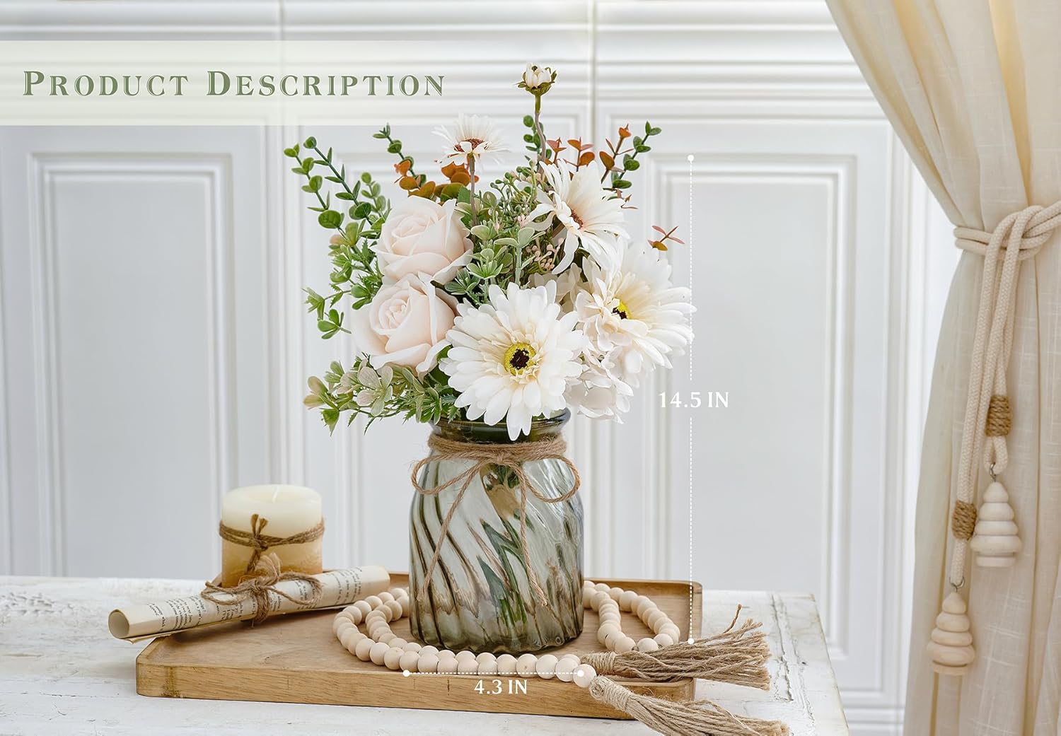 ❀Artificial Flowers in Vase: The fake flower arrangements decoration suitable for coffee table decor, living room decor and fall decorations. The silk floral decor include a fake bouquet and a glass vase. The flowers composed of white dasies, light champagne roses, white hydrangea and several artificial plants. The color of the flowers is soft and bright, close to the real flowers.