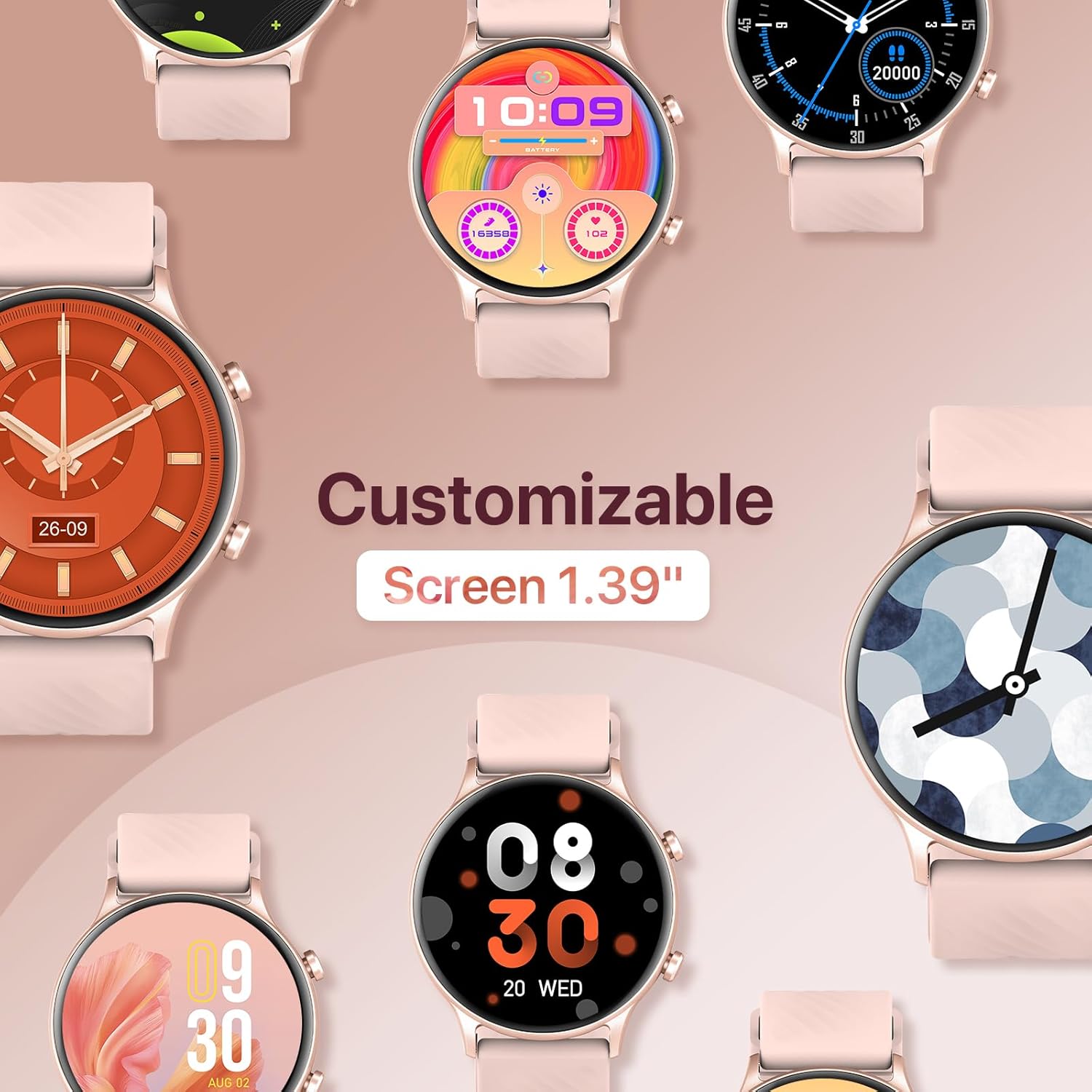 【Intelligent Fitness Watch】This fitness watch for women has many features you need for a better experience to gives you new ways to train and advanced. Supports 20 professional fitness modes including yoga and HIT, as well as 100 extended fitness modes , it accurately monitors and analyzes over multiple data points such as steps, calories burned, Pink round women fitness watch for iphone android compatible,blood pressure watches for women
