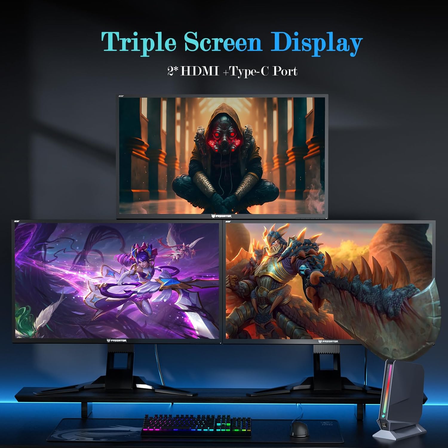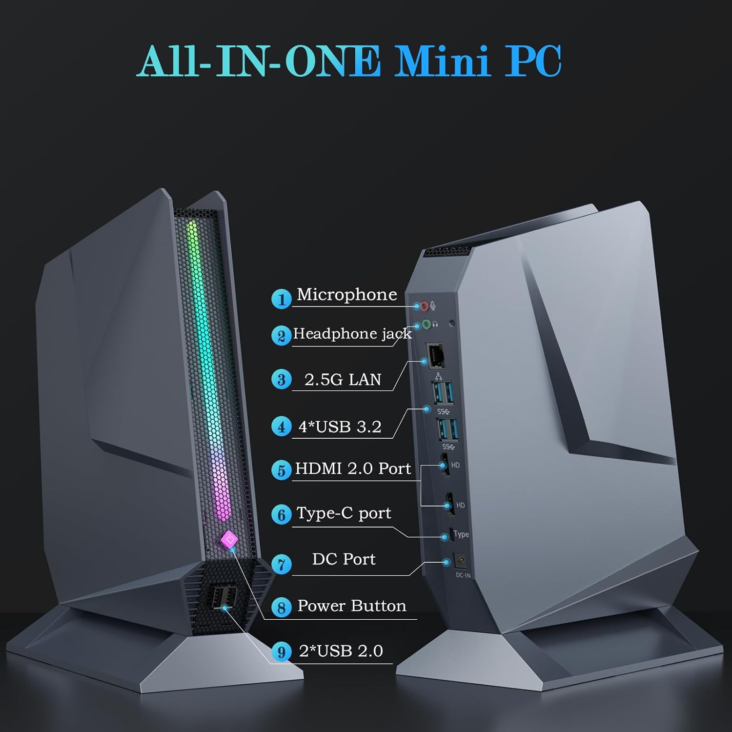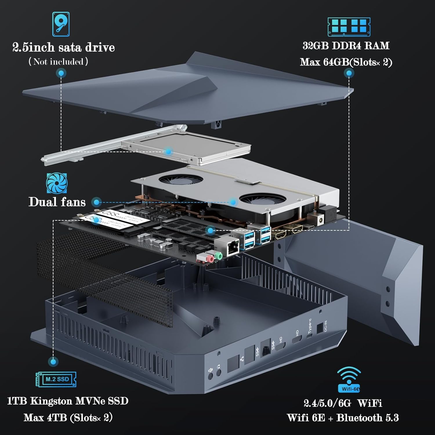 Gaming Desktop computer built-in 32GB(16+16) DDR4 3200MHz and 1TB Kingston M.2 2280 NVMe PCIe 4.0 SSD, It provides ample operational space and storage capacity, two slots provides excellent conditions for upgrading the mini computer. Additionally, it supports a 2.5-inch SATA hard drive(not included), further enhancing its storage capabilities.