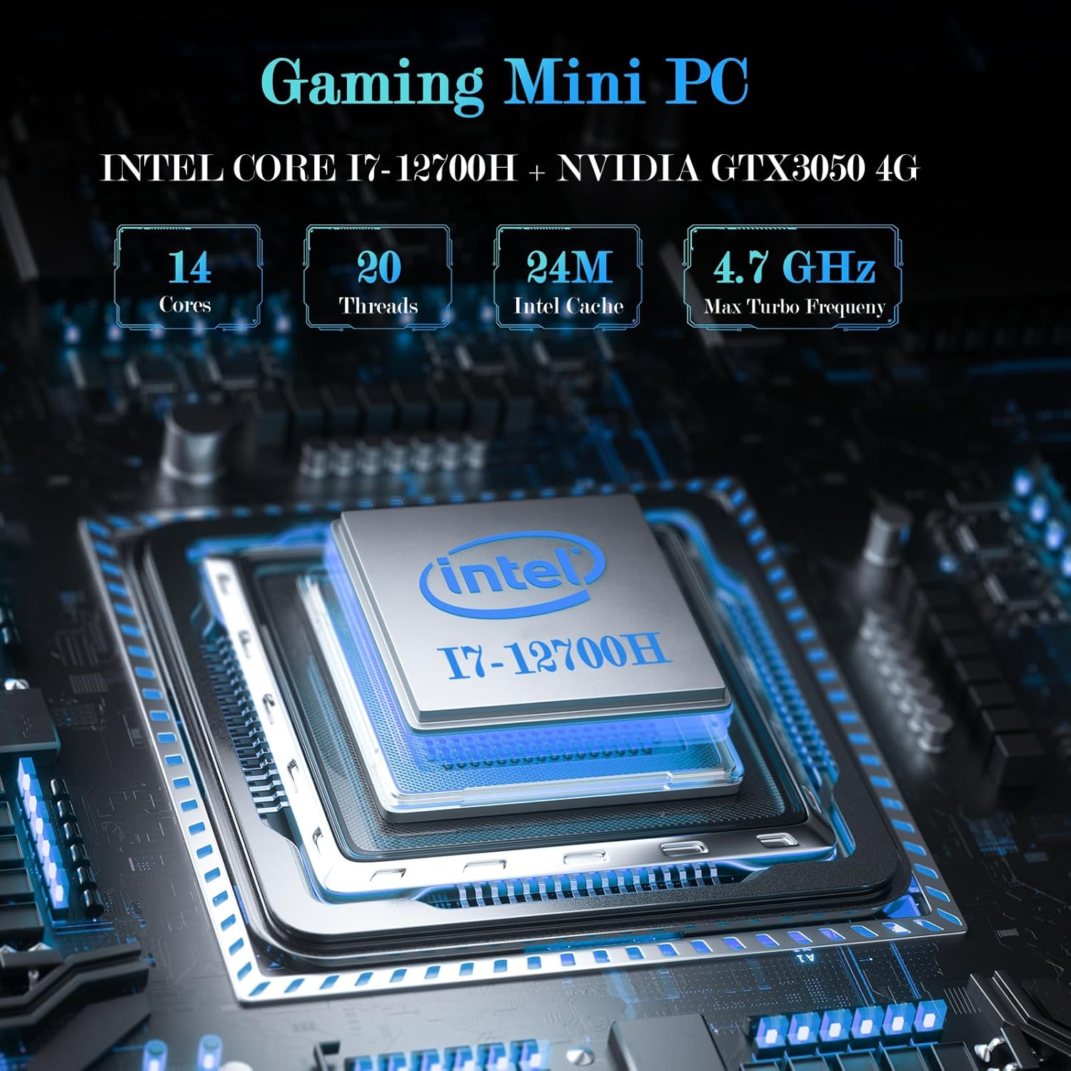 Gaming PC, Intel I7-12700H Mini PC Nvidia RTX3050 4G GDDR5 RGB Lights 14C/20T Desktop Mini Computer 32GB DDR4 1TB NVMe SSD, 2X HDMI Type-C, 2.5G LAN WiFi6E BT5.3, Windows 11 Pro