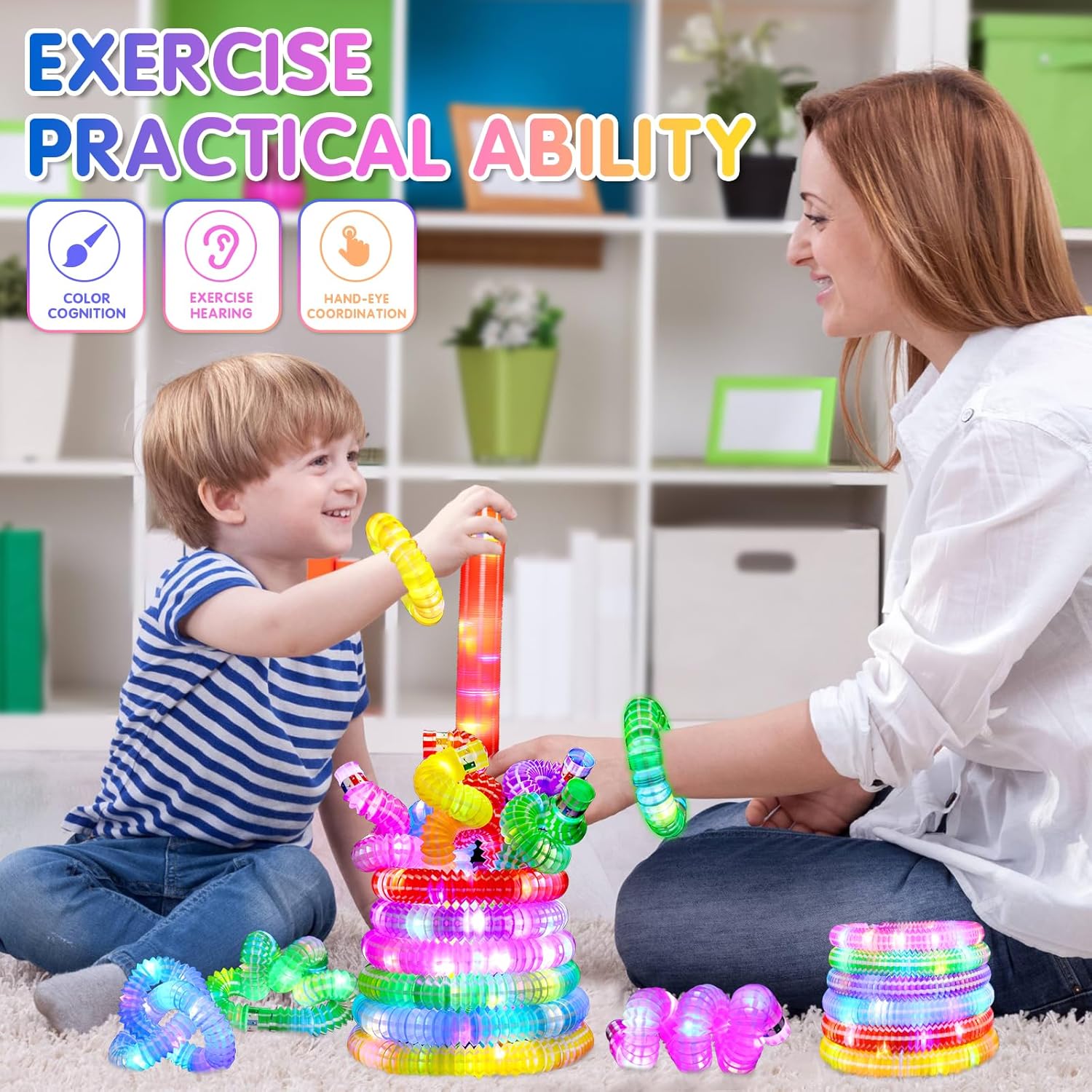 【Fidget Toys for children】 Pop tubes can be elongated, folded, connected into any shape it can also make a sound during playing. It’s great kids learning & education toys for autistic children. It can increase imagination and fine motor skills, provide tactile stimulation, color Identify, exercise auditory