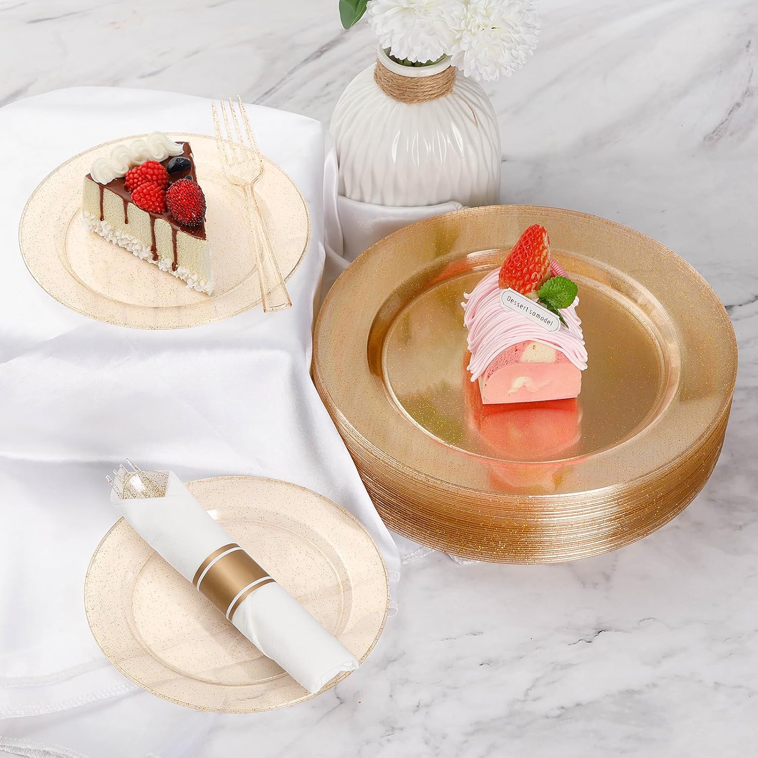 ELEGANT DESIGN – These Gold Glitter wedding plates look premium and similar to porcelain. Their elegant appearance can meet the aesthetic requirements of all people, and they can be used for any occasion without a sense of incongruity.