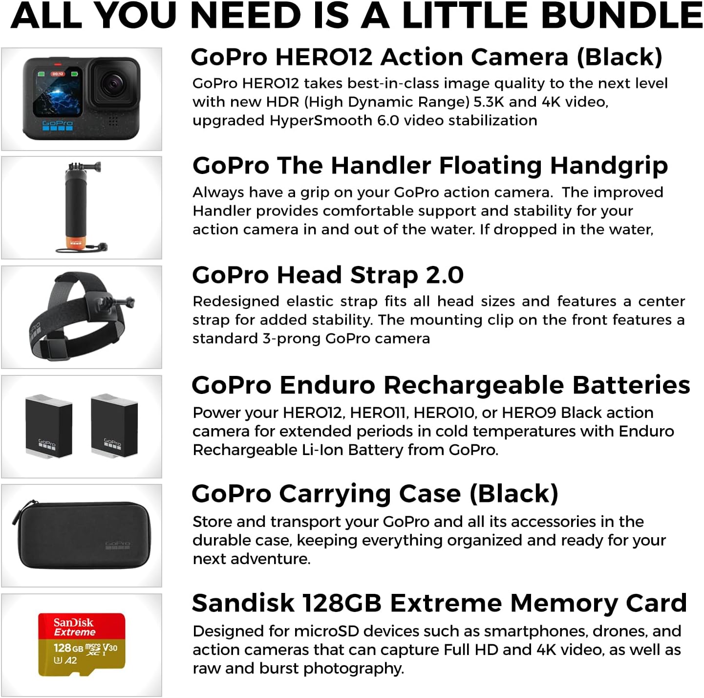 Bundle includes: 1 x GoPro HERO12 Black Action Camera, 1 x The Handler Floating Handgrip, 1 x Head Strap 2.0, Enduro Rechargeable Batteries (2-Pack), 1 x Carrying Case, 1 x 128GB microSDXC Memory Card with SD Adapter.