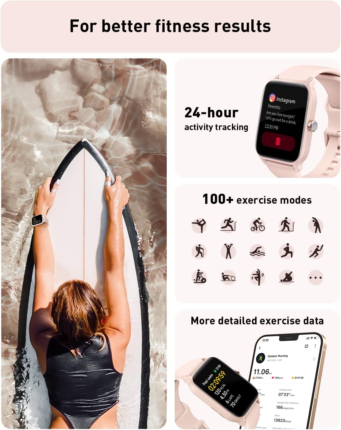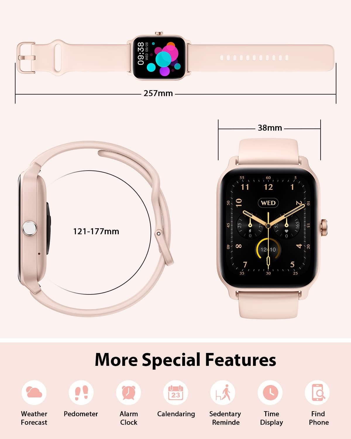【Receive/Dial Call & Alexa Built-in】Directly use the smart watch with text and call to make and answer calls through the built-in microphone. Stay connected to SMS and APP messages(Text, Facebook, WhatsApp, Instagram, Twitter, etc.), never miss any important information. Amazon Alexa on your smart watch for women frees your hands from your phone. Ask questions, control music playback, check the weather, set alarms, timers, , all from your watch.